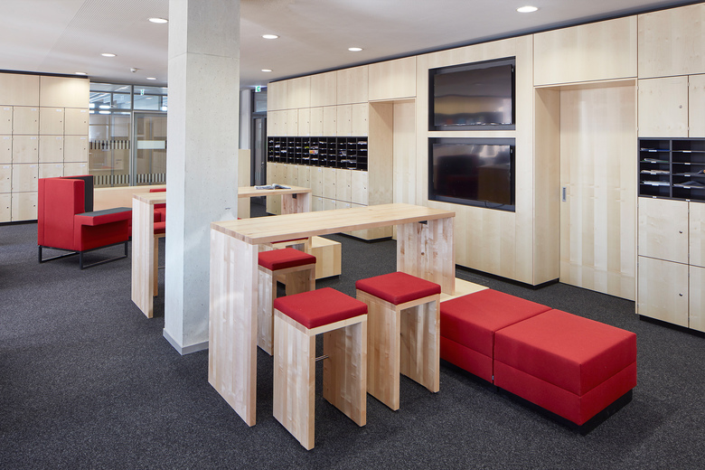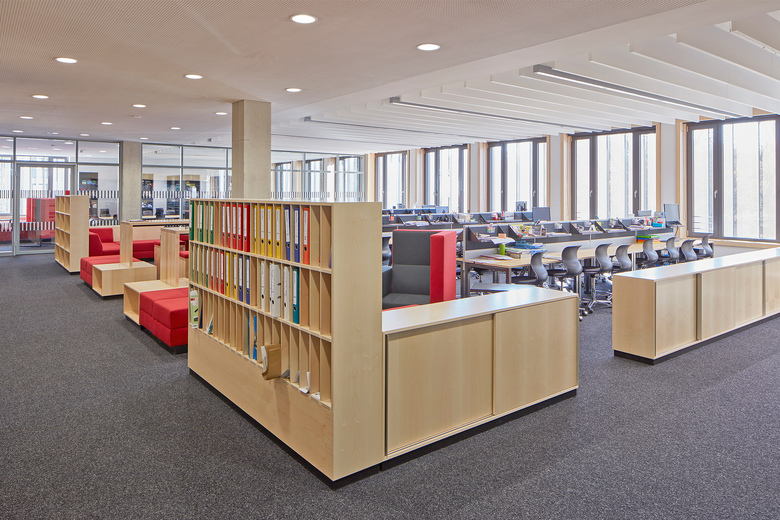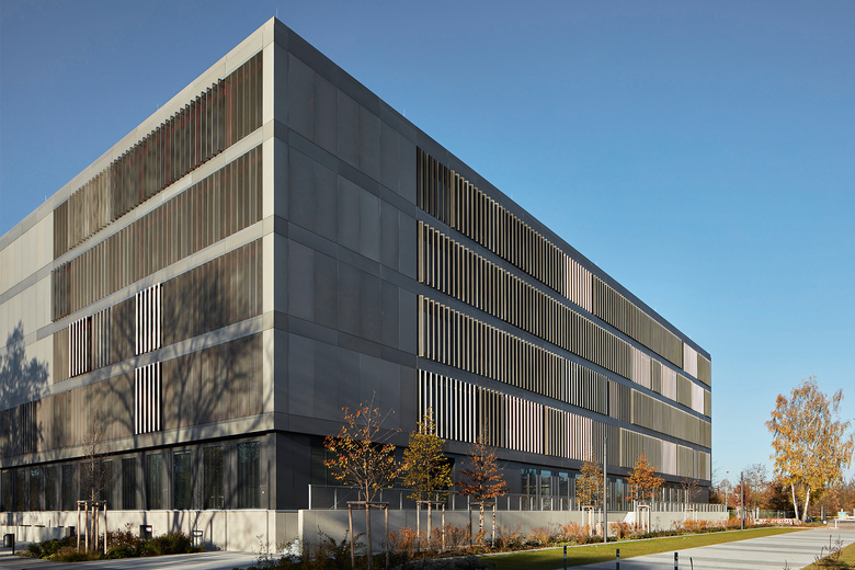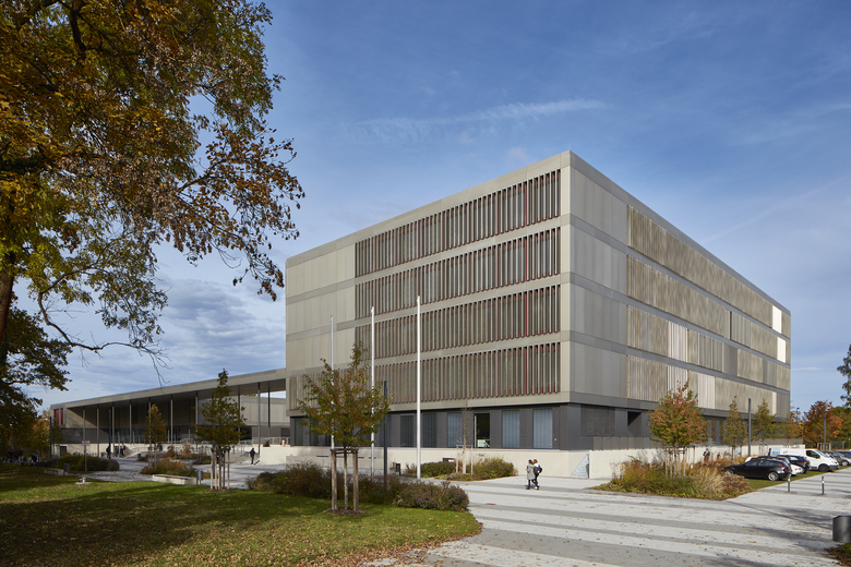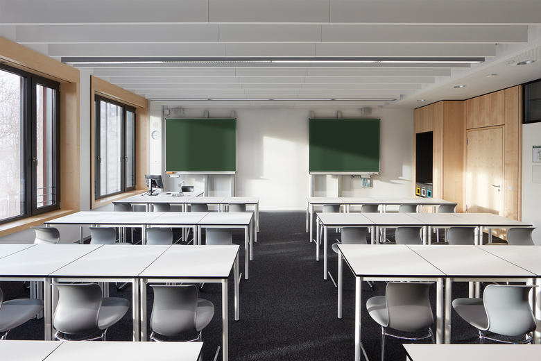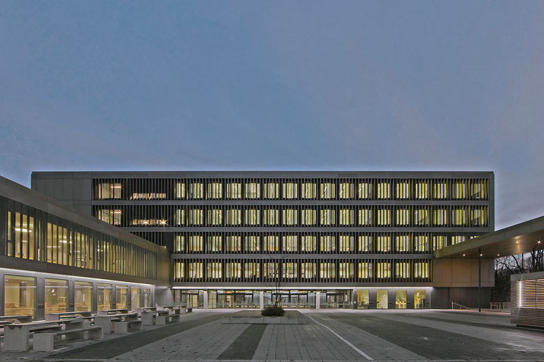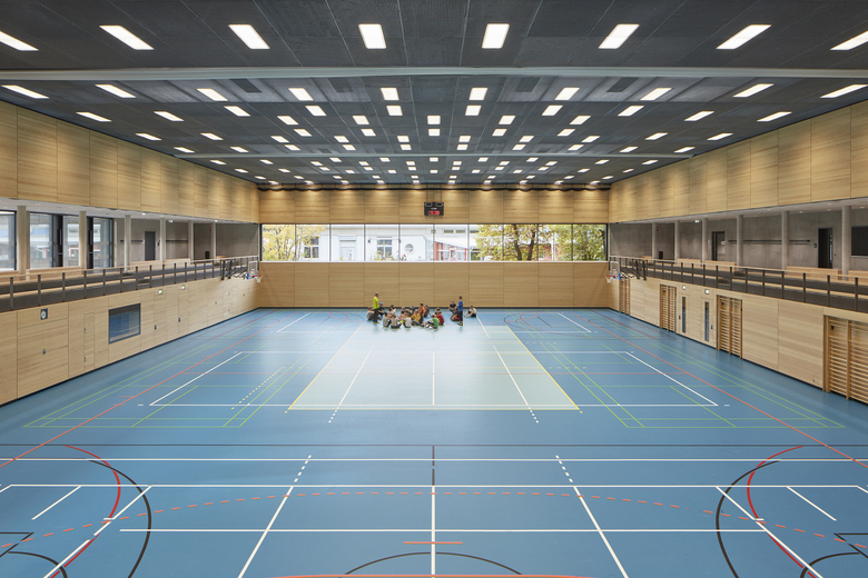 Fassade – Drehbare Vertikallamellen mit den Abmessungen 45 x 330cm werden als Permanentverschattungsanlage eingesetzt, die den Wärmeeintrag für das Gebäude wirkungsvoll und witterungsunabhängig verhindern und gleichzeitig natürliches Licht in den Klassen optimieren und Ausblicke ermöglichen. Die Lamellen werden auf auskragenden Stahlschwertern weit vor der Fensterkonstruktion angeordnet, um den vollen Drehradius zu schaffen. Die Stellung der eloxierten Alulamellen mit Streckmetallfüllung passen sich automatisch an den jeweiligen Sonnenstand, Wind und Temperatur an. So entsteht zum einen ein spannungsvolles Spiel aus offenen und geschlossenen Elementen, zum anderen verstärken die Lamellen im geschlossenen Zustand die homogene Körperlichkeit des Gesamtensembles.
