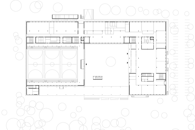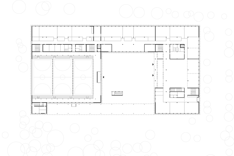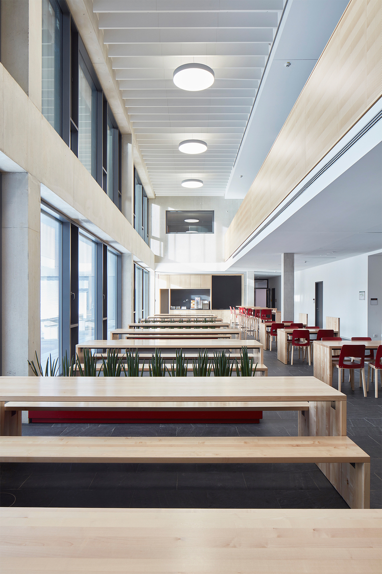 Das Schulzentrum besteht grundlegend aus zwei Elementen, dem zweigeschossigen Sockel mit Sporthalle, Werkstätten und Zentralbereich und aus dem dreigeschossigen Theorietrakt. Der Schulbaukörper ist ringartig um ein Atrium organisiert, welches im 1.OG als Luftraum für die zentrale Aula dient. In den Geschossen 2 bis 4 wird das Atrium zum Außenraum (Innenhof). Dies erleichtert die Orientierung im Gebäude und schafft eine kommunikative Atmosphäre sowie Blickbeziehungen. In den Obergeschossen werden jeweils zwei Fachcluster mit attraktiven mehrfach nutzbaren Aufenthaltszonen kombiniert. Diese Zonen bieten Ausblicke bei Aufenthaltszonen und Einblicke in den Innenhof. Auch die Arbeitsinseln werden dem Innenhof zugeordnet und somit natürlich belichtet. Im Sockelgeschoss sind Verwaltung, Lehrerbereich und zentrale Räume angeordnet. Der zweigeschossige Werkstattbereich wird linear organisiert. Durch das abgesenkte Spielfeld kann die Sporthalle in das zweigeschossige Konzept der Schulanlage integriert werden. Der Wettkampfnutzung entsprechend, können die Zuschauer so die Zuschauerränge an den beiden Längsseiten ebenerdig erreichen. In Kombination mit dem Foyer wird die Nutzung der Halle als Veranstaltungsraum der Schule unterstützt.