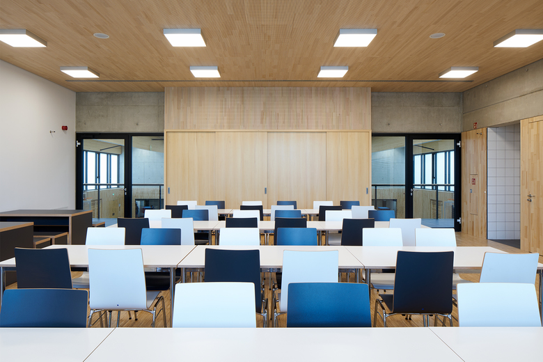 Eine Sichtbetonwand im Erdgeschoss markiert den Eingangsbereich mit Foyer und vertikaler Erschließung. Ein Steg mit direkter Anbindung an die Ringerschließung der Realschule ermöglicht den Ganztagesschülern einen trockenen Übergang zum Speisesaal.