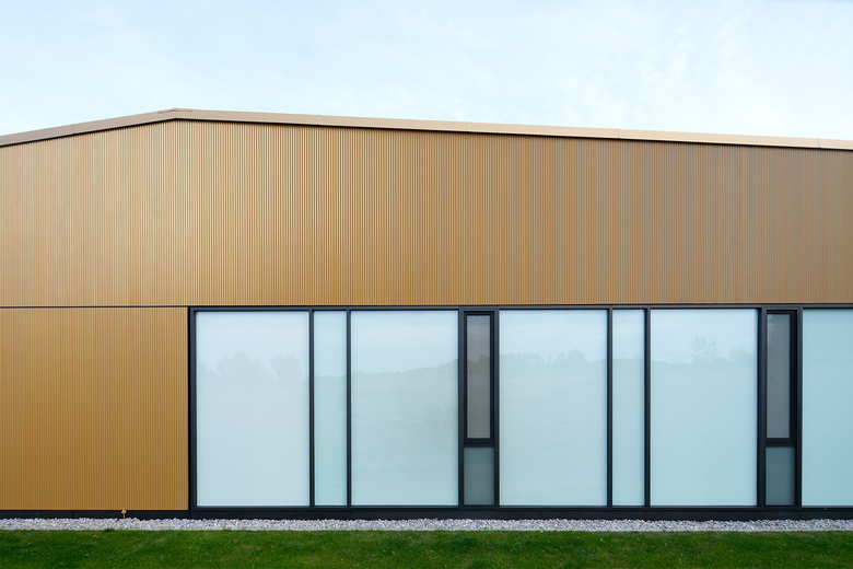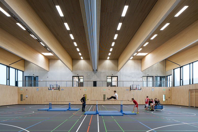 Zur Gewährleistung der Barrierefreiheit liegt das Erdgeschoss-Niveau auf Höhe des Bestandes und wird in die Bestandstopografie integriert. Die natürliche Belichtung und Belüftung der Sporthalle erfolgt über 2 Lichtbänder mit integriertem Blendschutz aus Kapillargewebe im Scheibenzwischenraum. Im Bereich der Umkleiden ist das Gebäude zweigeschossig. Die bronzefarbene Hülle beinhaltet den Luftraum der Sporthalle und die Räume des Ganztagesbereiches inkl. Küche.