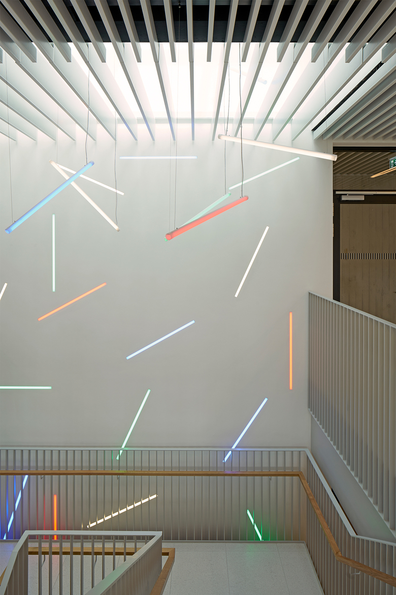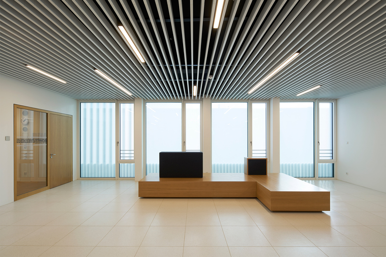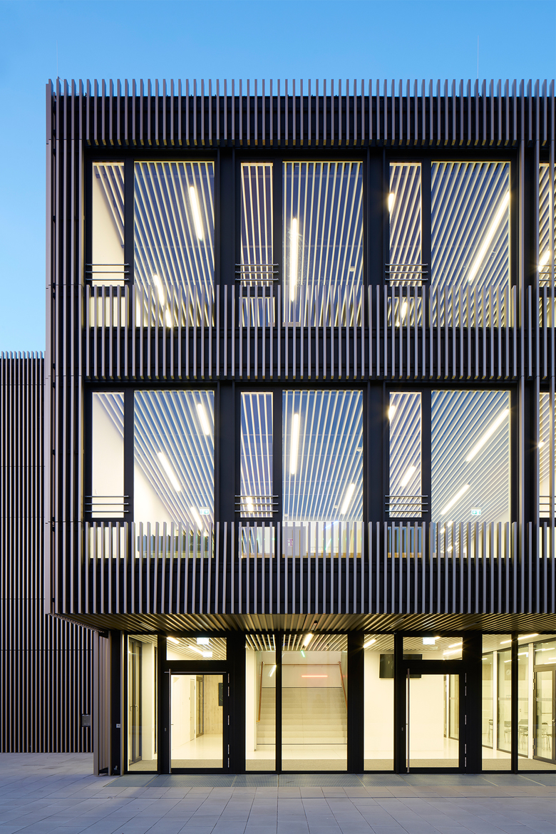 Die Fassadelamellen folgen konsequent dem Gebäuderaster, welches auch im Innenbereich über abgehängte Akustiklamellen in den Flurbereichen fortgeführt wird.