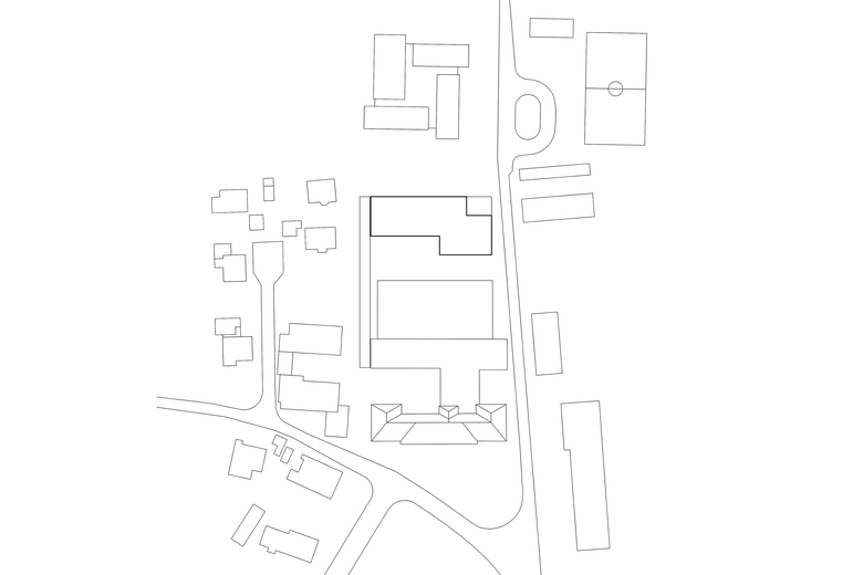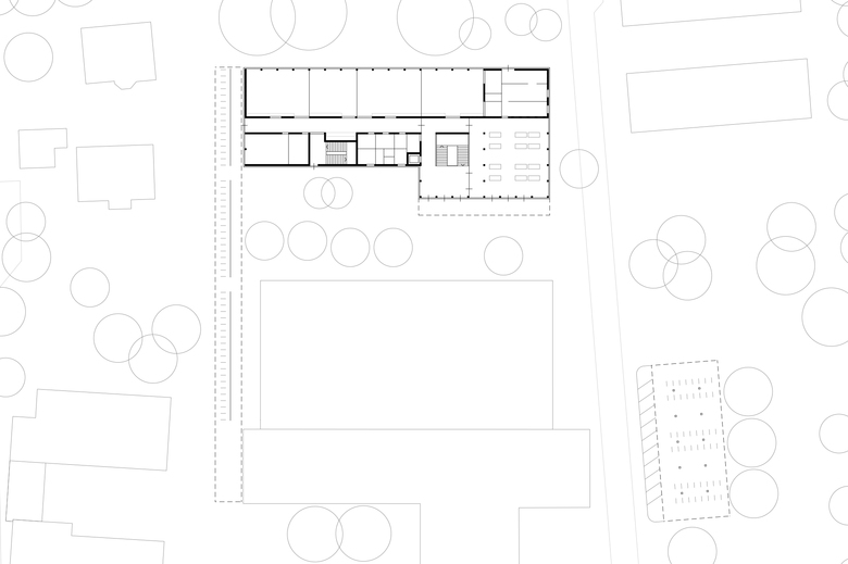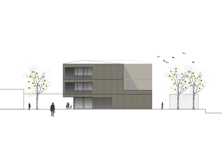 Dabei orientiert sich der dreigeschossige Neubau mit seiner Geometrie parallel zur Bestandsstruktur in Ost-West-Richtung im Westen an den festgelegten Baulinien, im Osten an den erforderlichen Abstandsflächen zur Rathausstraße und im Norden an den Bestandsbäumen.