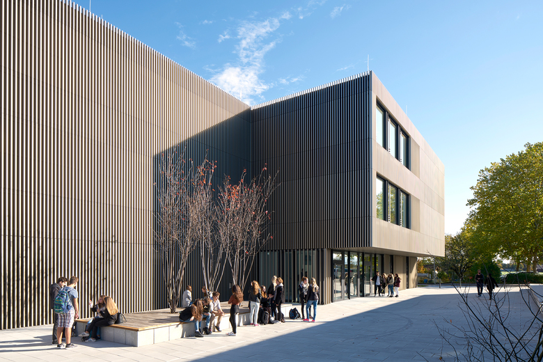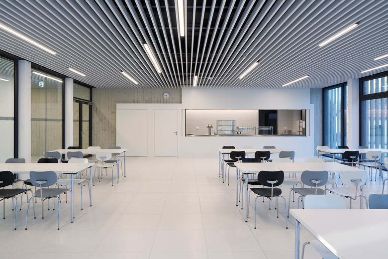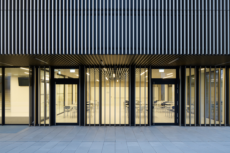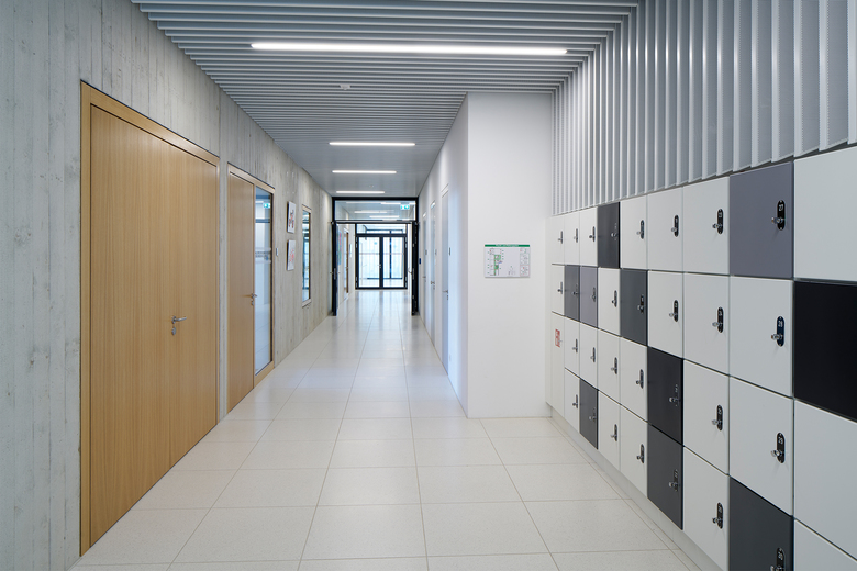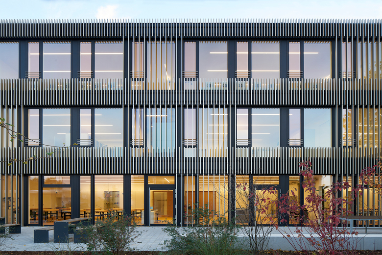 Der Baukörper und sein äußeres Erscheinungsbild orientieren sich in Größe, Materialität und Farbigkeit an den Bestandsgebäuden. Eine vorgehängte Fassade aus Aluminiumprofilen übernimmt den Witterungsschutz und sorgt gleichzeitig für eine Filterfunktion in Teilbereichen der Holz-Alu-Fensterflächen. Der Sonnenschutz wird über schienengeführte Anlagen mit Textilscreens sichergestellt und im Innenbereich mit Blendschutzrollos ergänzt.