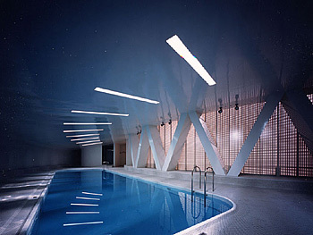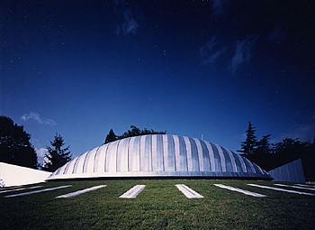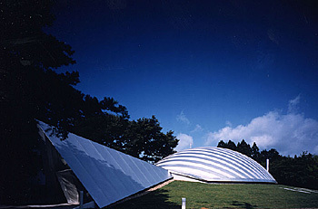The project uses LVL (Laminated Veneer Lumber) as a structural system. The difficulty of the project was to create the form of a 20 m x 20 m oval dome. Since LVL is a difficult material to mold into a three-dimensional shell figure, the first suggestion was to curve the LVL into a two-dimensional arch, and set many of them in such a way as to form a tree-dimensional oval form. The structural point of the material was also a challenge. The question was how this arch could span 20 meters with the load of snow that this structure would have to bear during the winter. To provide stronger support, the solution was to compose a space frame with LVL. In the short direction a pair of arches are set parallel to each other and placed to form the oval dome. In the longer direction, another set of arches along the long side are sandwiched in between the paired arches along the short side. The arches along the long side are set at such an angle so that they work as lattice members. Just as paper could surprisingly be a structural member depending on how it is used, thin plywood (LVL) can also be a structural element, which spans a distance beyond expectations. With this solution much less wood is used than in an ordinary dome structure using other wood lamination.
