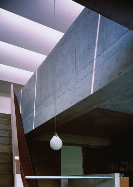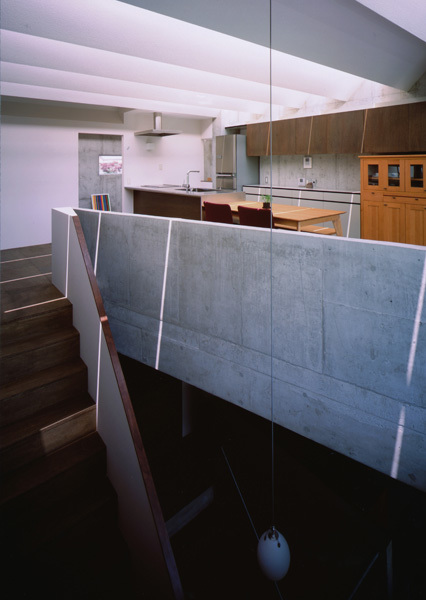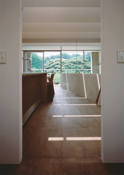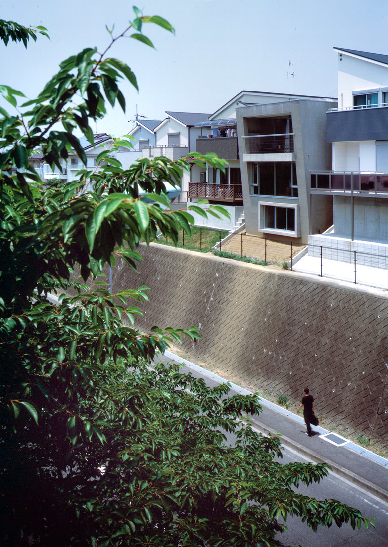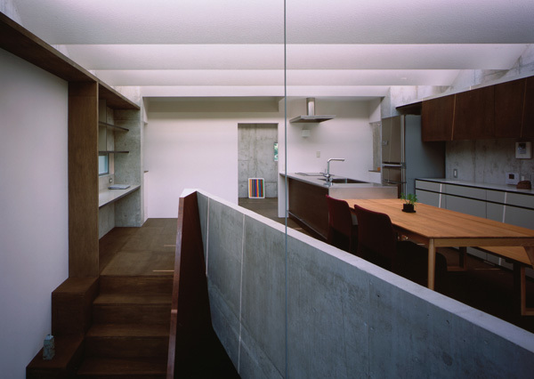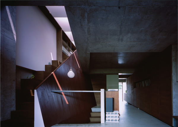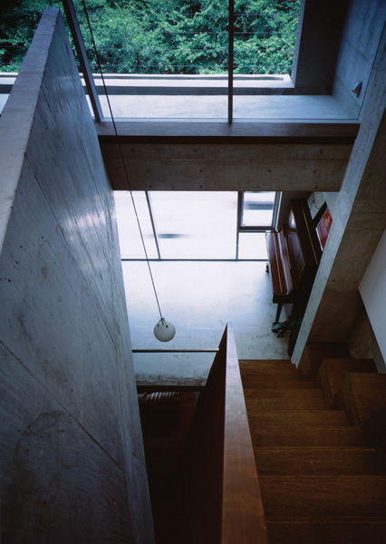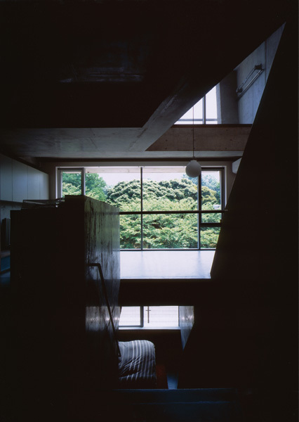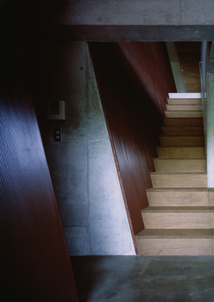 Across the street from this property is a park with groves of plum and cherry blossom trees. We aimed to incorporate views of this landscape into the home to the greatest extent possible. A shifted staircase creates room for a crevice-like ventilation shaft that links all three floors of the building.