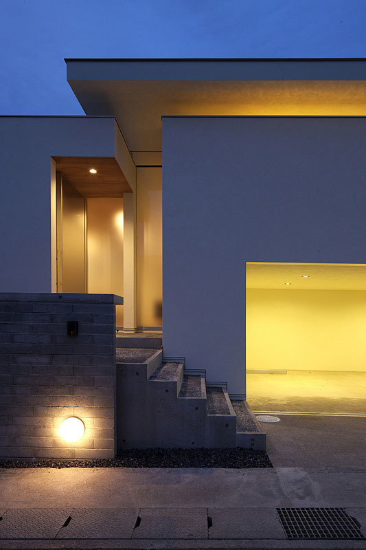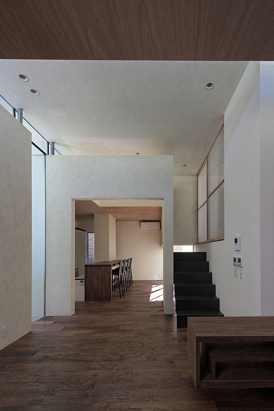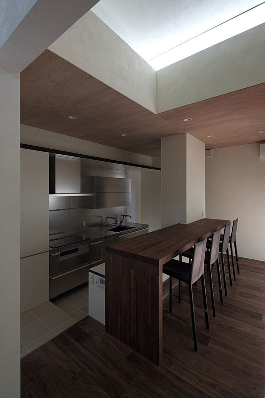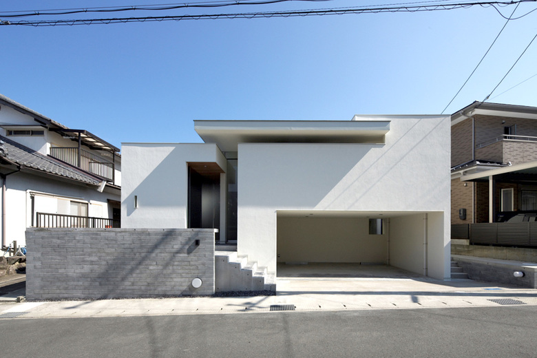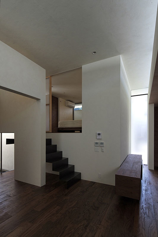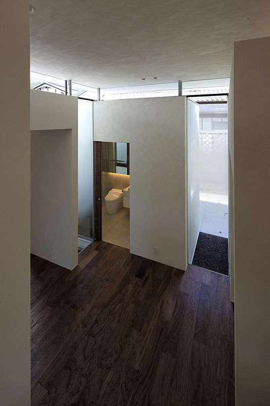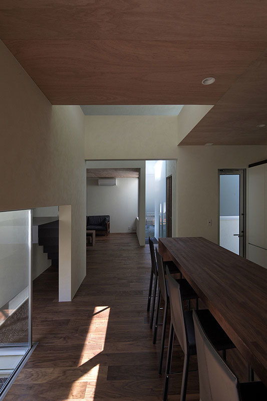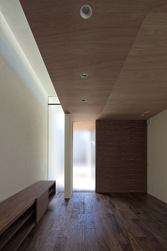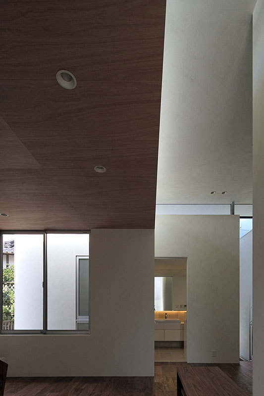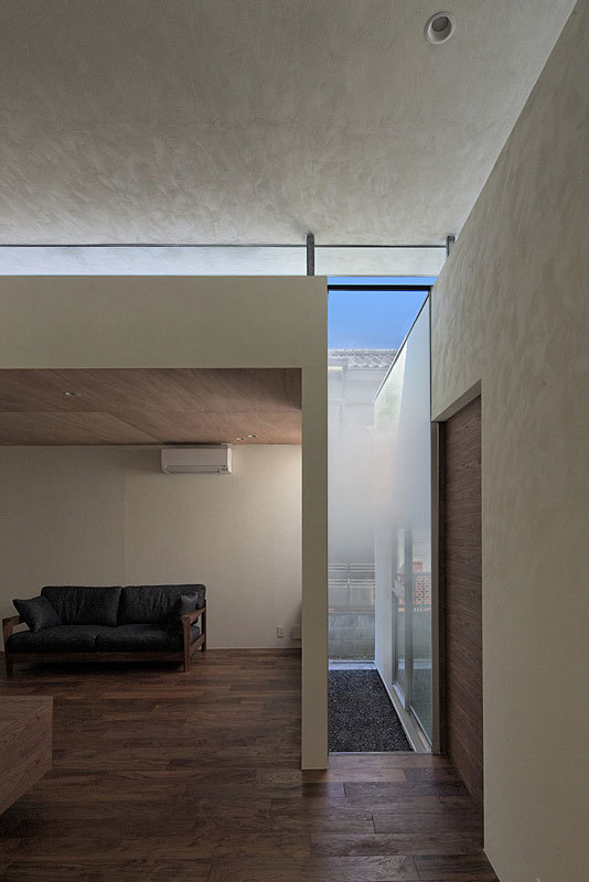 The client for this project dislikes direct sunlight, so the architects centered their design around his request that the house not be overly bright. A light court serves to divide up the building’s single volume; it also functions as a vertical slit that brings fresh air and natural light inside. The roof floats slightly above the main volume, creating room for clerestory windows. These horizontal slits bring indirect light into the space.