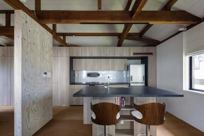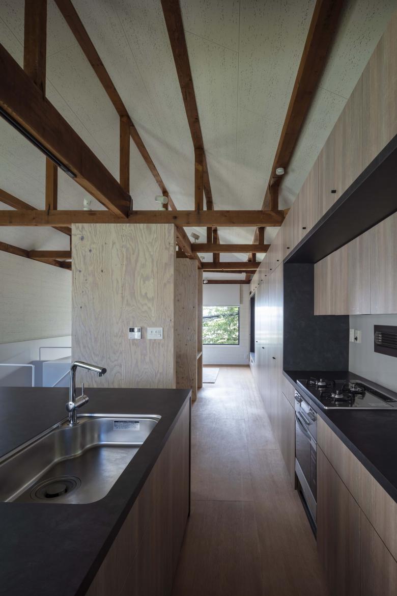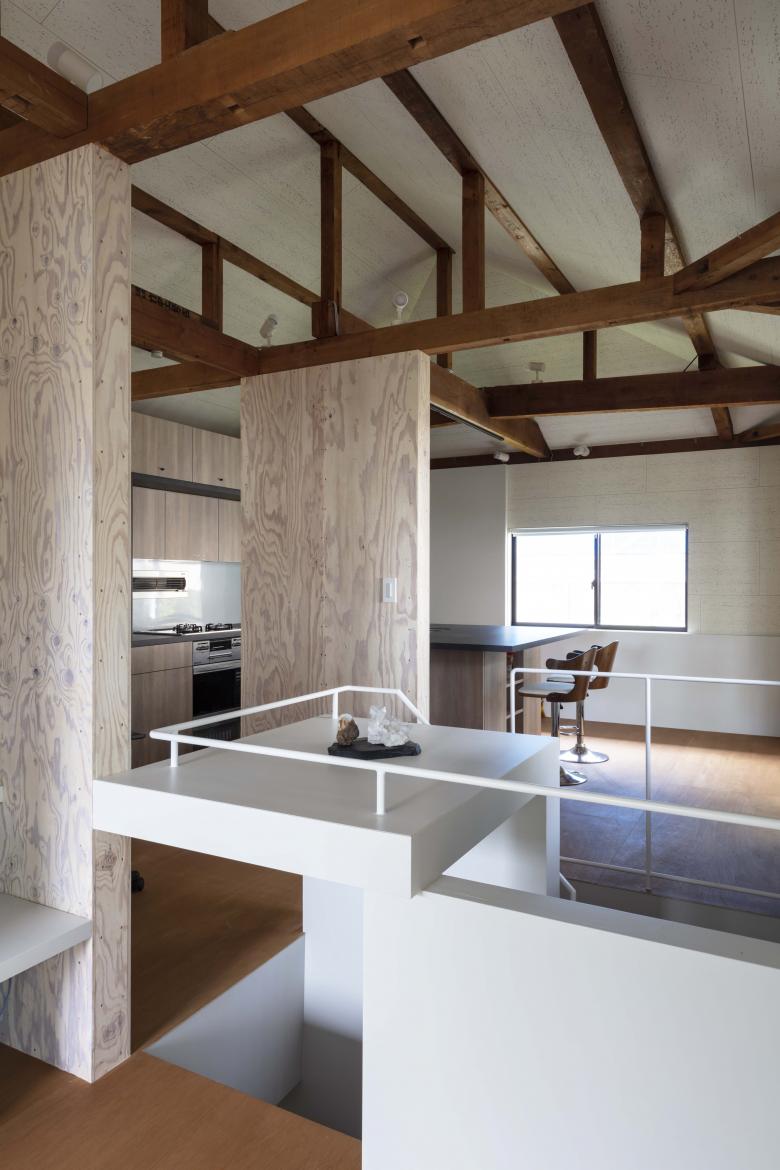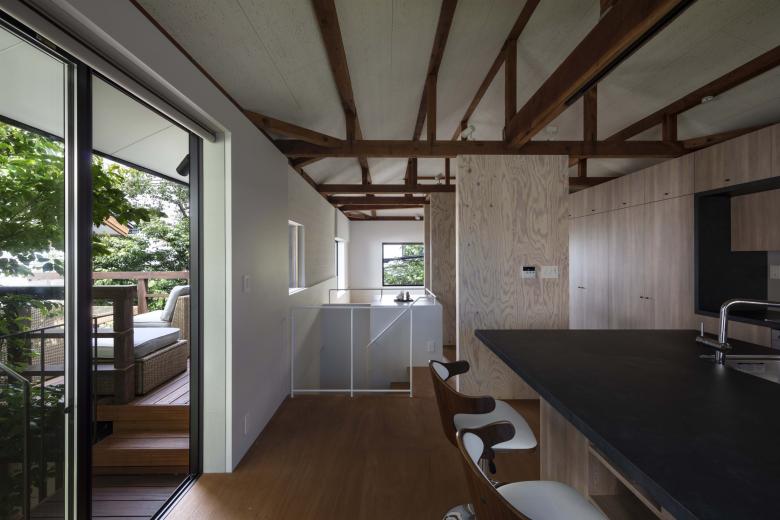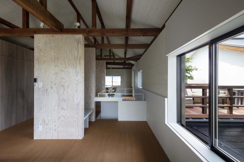 Renovation of a 50-year-old house. A small detached house connected to the main house where the parents live was renovated for the children. The plan was changed from the previous plan, in which private rooms were lined up around a central corridor, to a one-room plan in which the central corridor was reversed to form an earthquake-resistant wall. The ceiling was stripped to reveal the framework of the house, creating a sense of depth and spaciousness despite the small size. The upper part of the corridor connecting to the main house is used as a deck terrace to extend the outside space.