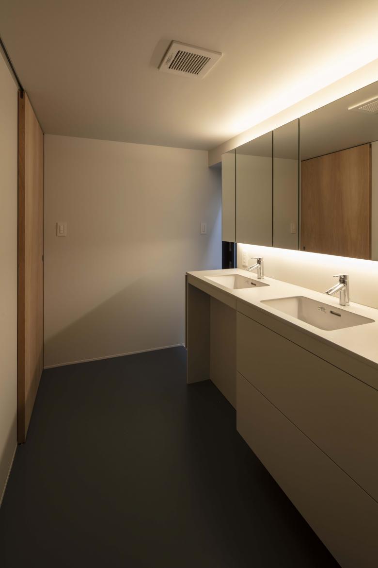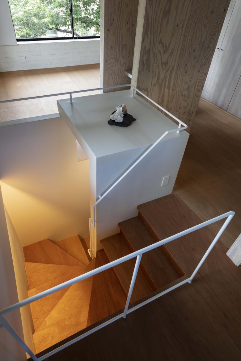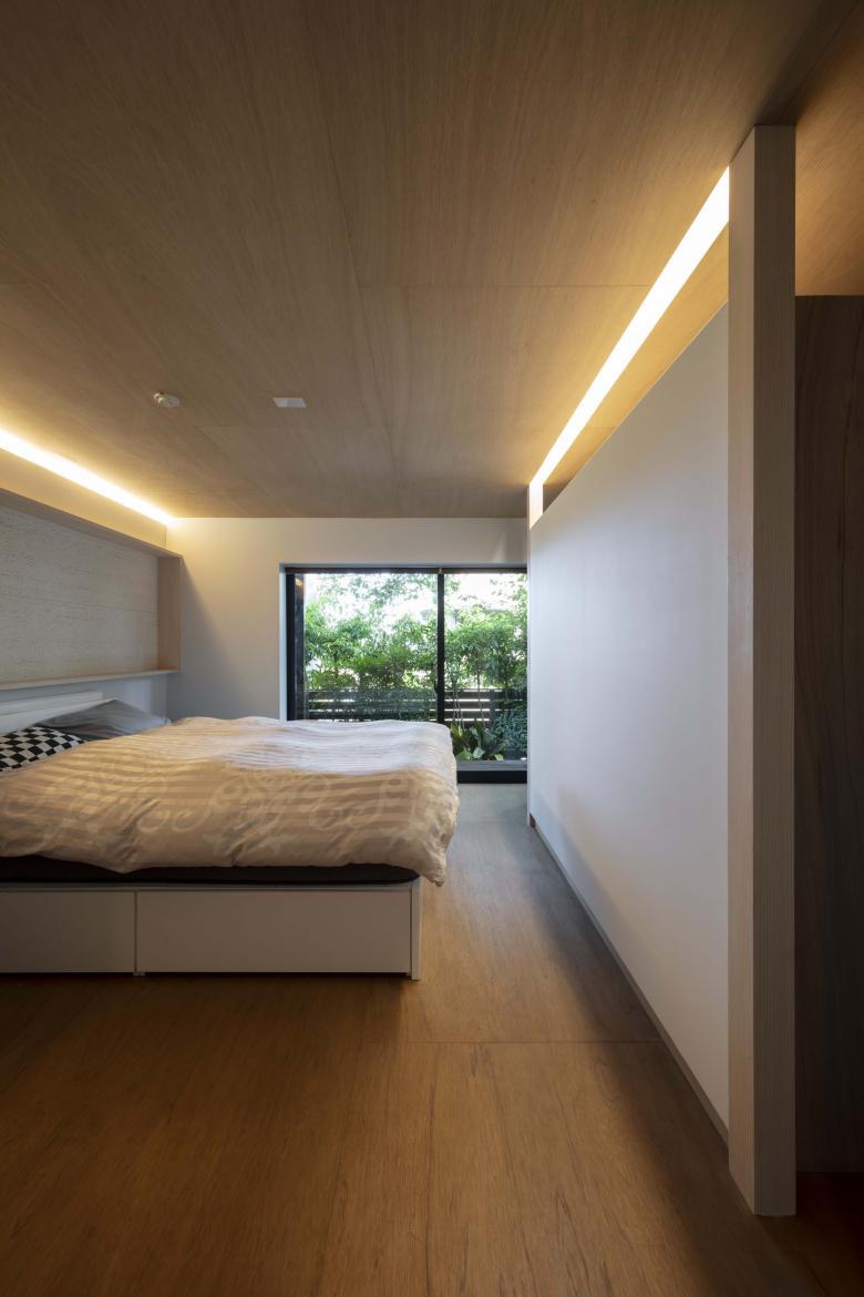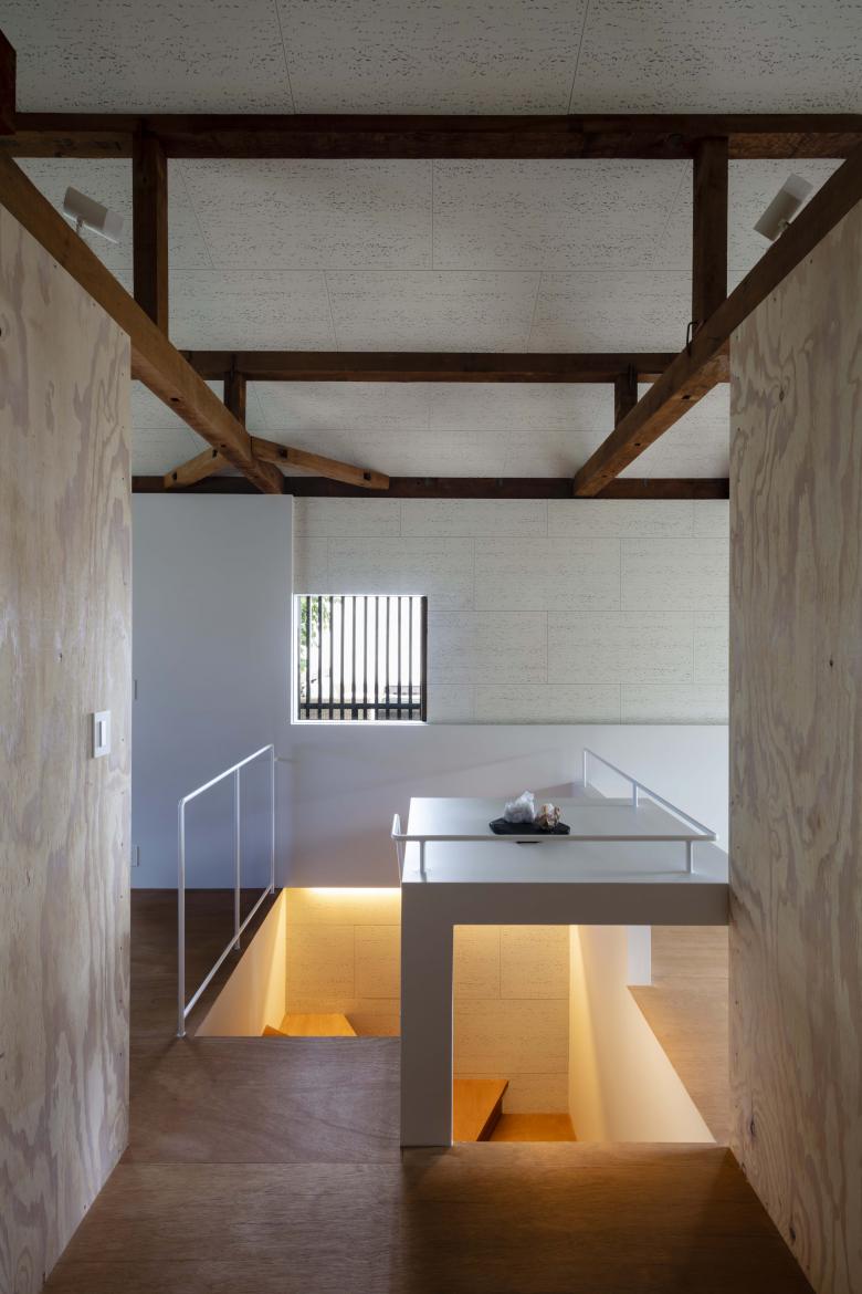 Renovation of a 50-year-old house. A small detached house connected to the main house where the parents live was renovated for the children. The plan was changed from the previous plan, in which private rooms were lined up around a central corridor, to a one-room plan in which the central corridor was reversed to form an earthquake-resistant wall. The ceiling was stripped to reveal the framework of the house, creating a sense of depth and spaciousness despite the small size. The upper part of the corridor connecting to the main house is used as a deck terrace to extend the outside space.