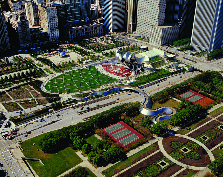 This master plan creates a seventeen-acre park, filling a void at the corner of Grant Park and connecting it to Michigan Avenue with a great lawn, pedestrian bridge, and concert pavilion. Abundant and varied public space fulfills Chicago’s motto Urbs in horto, or “city in a garden.” With space for performance, athletics, and public art, like Anish Kapoor’s Cloud Gate and Jaume Plensa’s Crown Fountain, Millennium Park is a key element in an extensive urban revitalization.