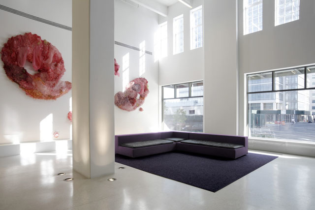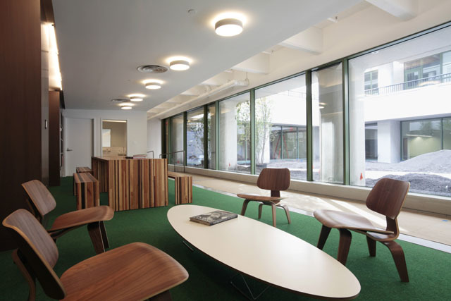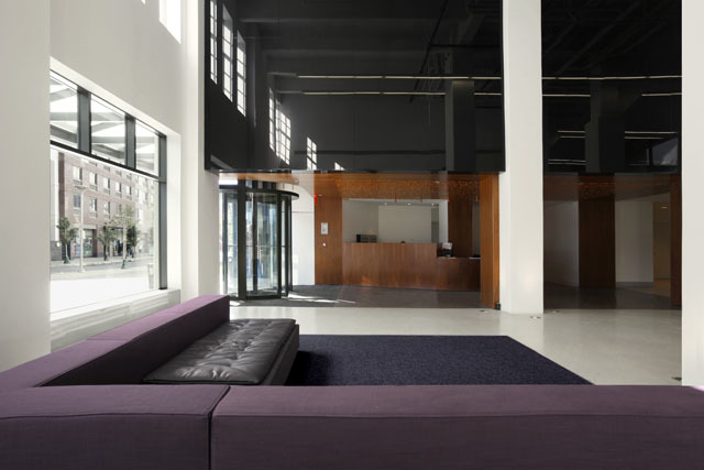 In the public spaces we strove to create a design that incorporates the historic industrial shell of the existing building while adapting to its next phase as a residential building. The intrinsic appeal and distinguishing characteristic of this building will ultimately be the marriage of modern design with industrial heritage. In that spirit, the junction of concrete with new materials is articulated clearly, allowing the occupant to appreciate and understand both conditions. By focusing on specific moments for new intervention within the expansive existing industrial shell we were able to create a refined luxurious experience at specific points of contact with occupants while also maintaining and celebrating the authentic, industrial character of this historic building. These smaller scaled refined insertions are also an efficient and cost effective way to deal with the huge scale of the existing structure.