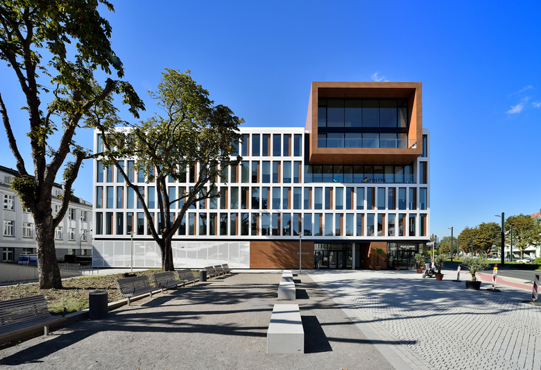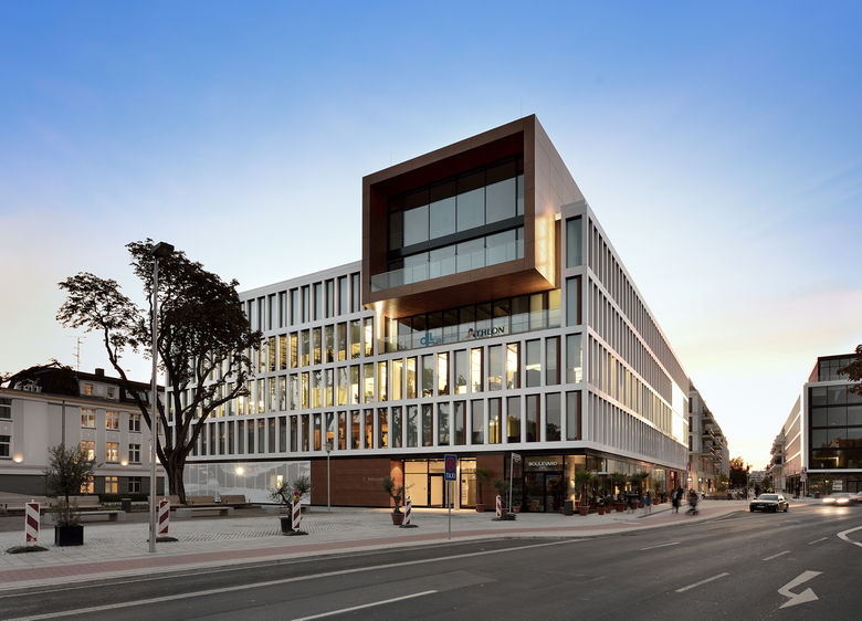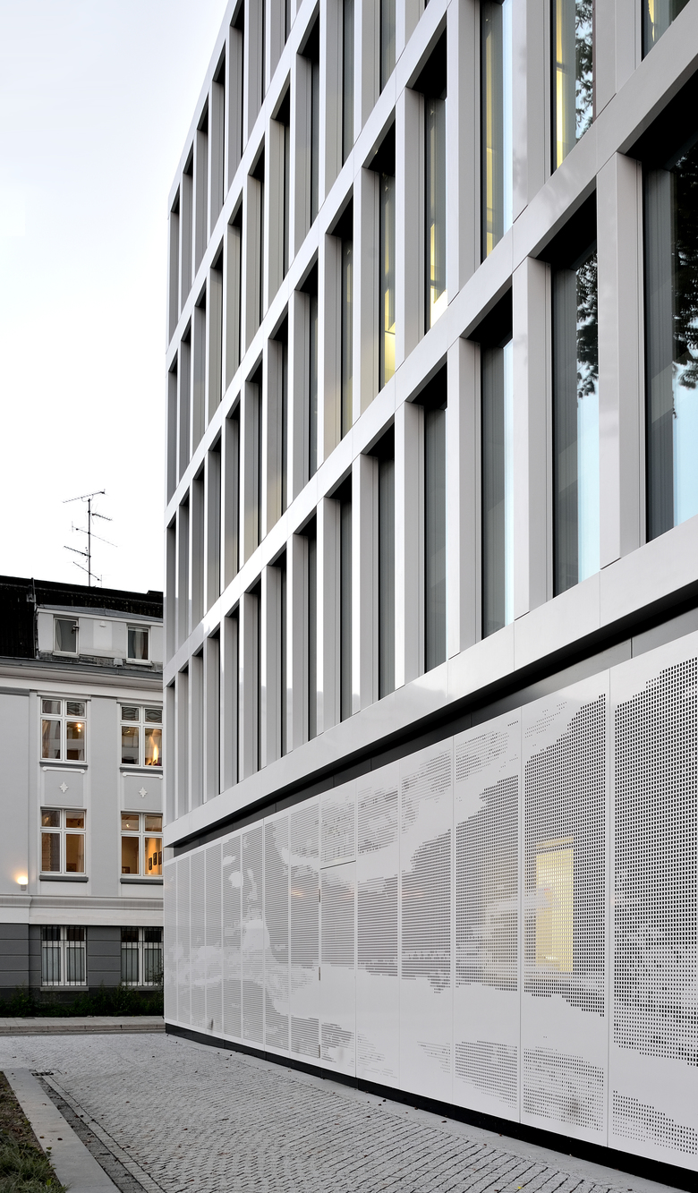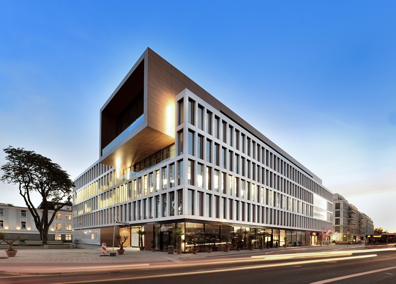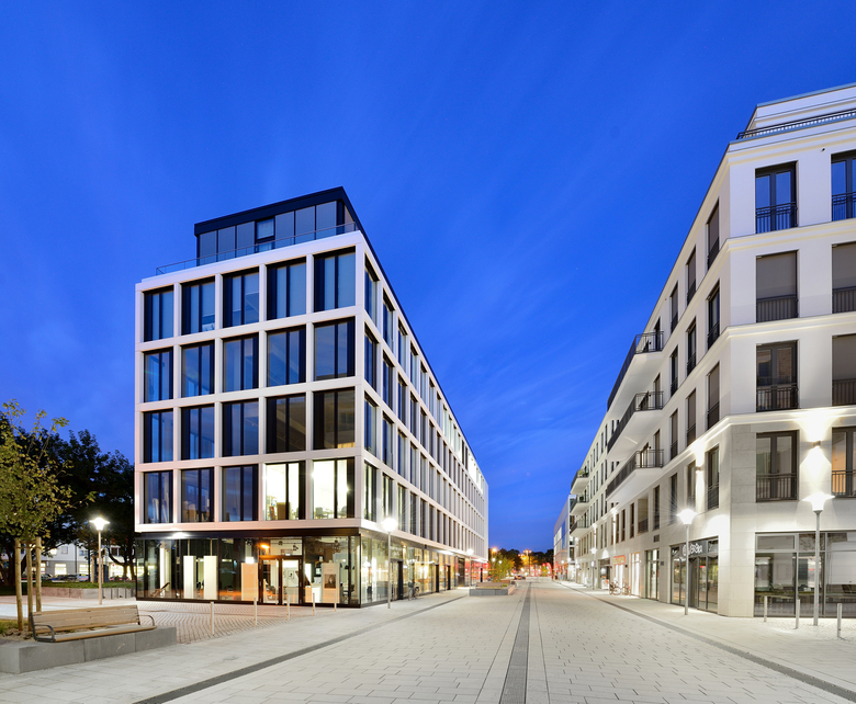The site of a former freight train depot in the Oberkassel district of Dusseldorf is being revitalised by the BelsenPark development and instilled with new life. Criss-crossed by grassy corridors, a green residential and office district is emerging around a 20,000-square metre park and its central lake. Situated directly on bustling Belsenplatz, the BelsenPark office buildings of Belmundo and LaVista by sop architekten form the spatial entryway to the new district. The five-storey office and commercial buildings accommodate retail shops and restaurants with their ground floors, which can be accessed via a pedestrian street leading to the park. Plazas around the buildings are used as outdoor patios by the restaurants. Both buildings express a clear and timeless architecture, as well as convey a calm and welcoming image through their open and harmonised façades. A partially glazed ground floor serves as a plinth, supporting a restrained four-storey building of continuous outer edges and sheet metal pilasters arranged in a strict grid. A sectional view of the larger, almost 16,000-square metre building reveals recessed panels alternating with floor to ceiling windows, while the smaller building of around 4,300 square metres has a higher proportion of glazed surface thanks to its 2.5-metre wide, ceiling high windows. The grid façades ensure that the office space inside the buildings – which can be easily arranged to accommodate single, double or open-plan designs – remains brightly lit and filled with light. The penthouse floor of LaVista, the smaller building, also features a wrap-around terrace for tenant use. A two-storey, cantilevered box on top of the larger Belmundo building sets an urbanistic tone. The 2.5-meter penthouse structure in contrasting colour juts out over the public square, looking like a monitor towards Belsenplatz, and creates a visual architectural relationship between the newly emerging area and its urban surroundings. The laser-cut elements of white metal that clad part of the façade of the ground floor create exciting patterns. The Belmundo building has already been certified as a ‘Green Building’ and has been awarded the ‘Gold’ label standard from the DGNB (German Sustainable Building Council) for its sustainable overall concept. Location Dusseldorf Oberkassel Developer CA Immo Deutschland GmbH Team Helmut Oberholz, Nicole Diewald, Katja Knaup, Iljana Slapa, Edith Schewerda, Volker Lau, Markus Lücker.