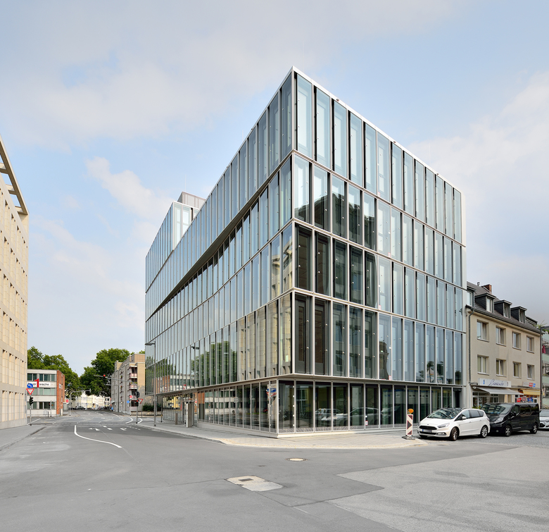 The light-flooded, five-storey corner building is characterised by an informal façade with contrasting projections and recesses that invite users to enter the new build, while the materials used in the glass and metal façade form an optical connection between the two buildings.