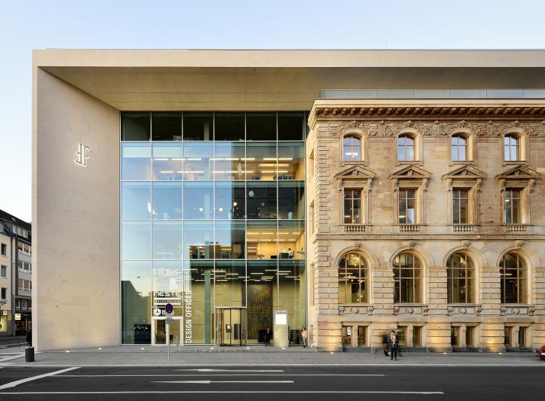Though unlisted, the area’s residents had long considered the ornate natural-stone frontage something of a local landmark and the architects were keen to retain it. Surrounded by the transparent surface of the new glass facade, it continues to carry the weight of a stand-alone building. A physical reminder of the region’s Prussian heritage and featuring the city arms of Cologne, Koblenz, Dusseldorf, Aachen and Trier, it now enjoys a prominent position in the urban space and lends its own distinctive character to this modern new build.