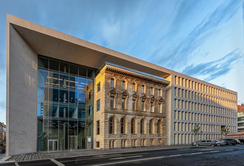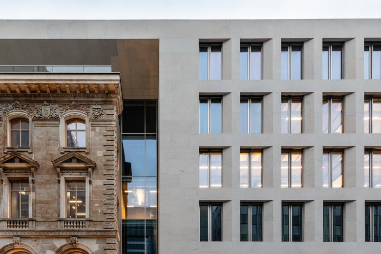 Designed by slapa oberholz pszczulny | sop architekten, its clean lines and pared-down architecture, measuring 115 metres in length, bring a calming note to the streetscape and incorporates a fine and carefully preserved classical facade at the centre of the structure.