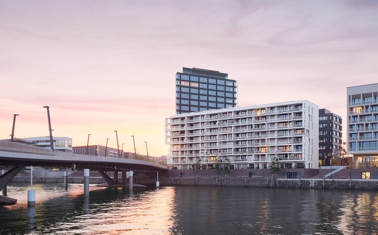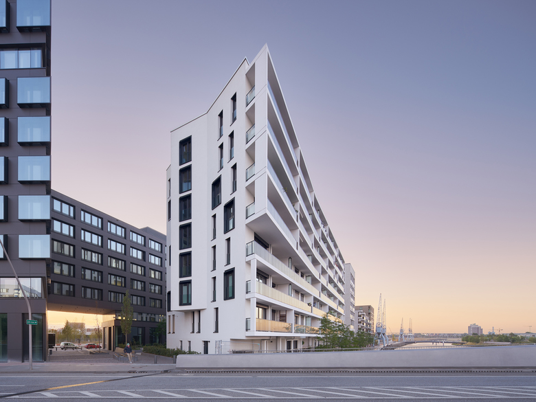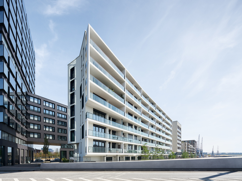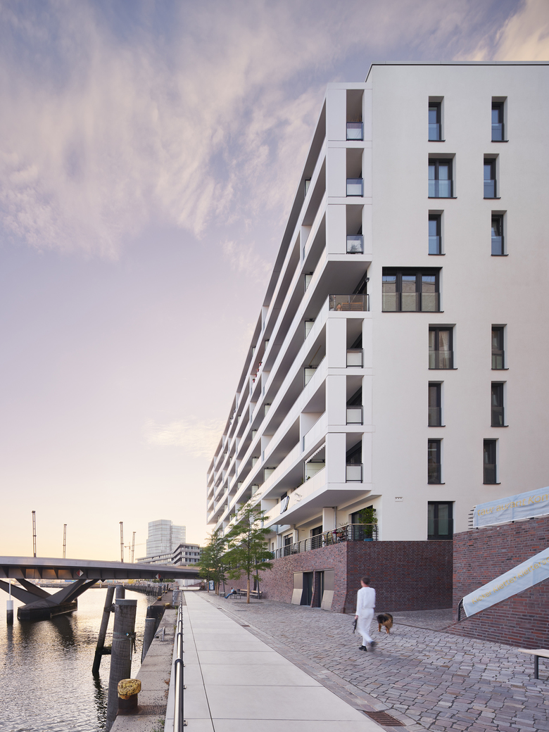 Am größten Hafenbecken der Hamburger HafenCity, dem Baakenhafen befindet sich das Wohngebäude On Board von slapa oberholz pszczulny | sop architekten, das gemeinsam mit dem Campus Tower von Delugan Meissl ein Ensemble östlich der Baakenhafenbrücke bildet.
