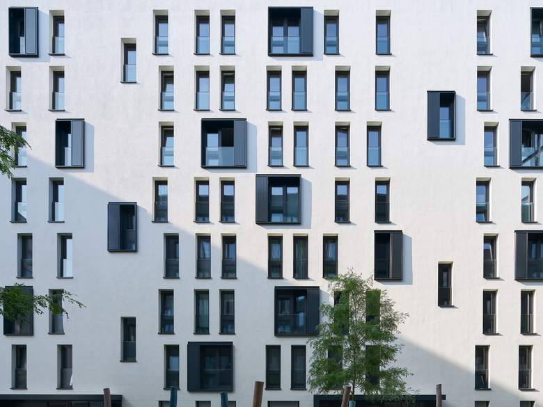 Die 40 Eigentums- und 24 geförderten Mietwohnungen für 2 bis 4 Personen des rund 9.400m² BGF umfassenden Neubaus verfügen alle über großflächige Balkone; die Penthouses im 7. OG über zusätzliche Dachterrassen. Im Innern sorgen großzügige Grundrisse mit offenen Wohnküchen für eine stimmige Raumaufteilung.