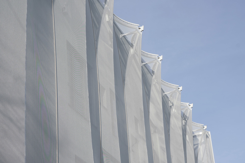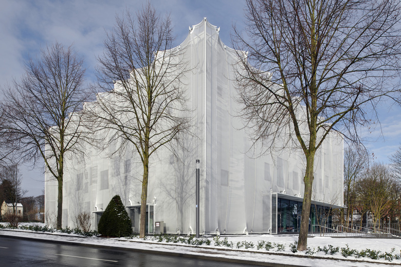 Die Architektur des Baukörpers transportiert die Lehrinhalte der Akademie nach außen und macht den vielfältigen Einsatz von Textilien bereits aus der Ferne erlebbar. Das 3-geschossige Gebäude wird von einer textilen Fassade umspannt. Wie der Faltenwurf eines Vorhangs legt sich das silbrig schimmernde Gewebe wellenförmig um den kantigen Betonwürfel. Die leicht transparente, beweglich anmutende Membran bildet dabei den größtmöglichen Kontrast zu der strengen Geometrie des dahinterliegenden Kubus.