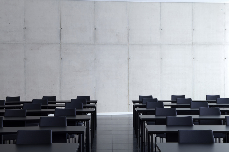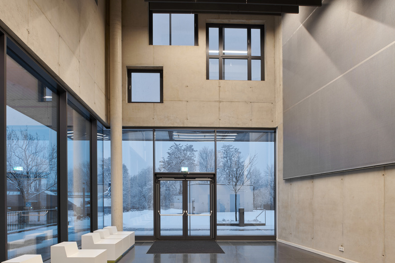 Im Inneren des lichtdurchfluteten Gebäudes befinden sich flexibel aufteilbare Lehrräume, ein zentrales Atrium, eine Aula und die Verwaltung der Akademie. Passend zum dominierenden Sichtbeton entwickelten die Innenarchitekten von slapa oberholz pszczulny ein zurückge-nommenes Konzept. So sind Einbauten und Möbel überwiegend in kontrastierendem Schwarz oder geweißter Eiche gehalten. Die mobilen, im ganzen Gebäude verteilten Sitzmöbel dagegen – ebenfalls von sop architekten entworfen – heben sich in ihrer hellen, variierenden Farbigkeit bewusst davon ab.