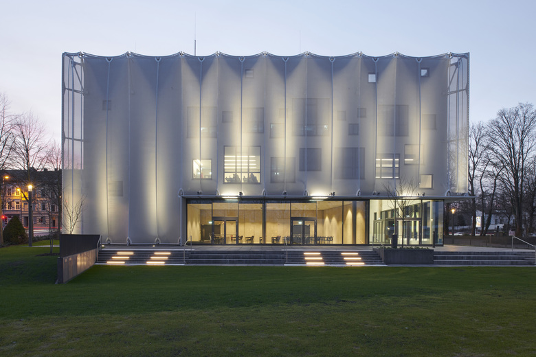Erscheint das Lehrgebäude bei Tageslicht als stoffartiges Gebilde, wird seine Wirkung in der Dunkelheit umso interessanter. Die hell erleuchteten Fenster scheinen dann durch das Gewebe und machen die dahinterliegende Gebäudestruktur erkennbar. Die unterschiedlich großen Fensterflächen verteilen sich unregelmäßig über die Fassade und erzeugen so eine zusätzliche Spannung. Der Eingangsbereich, der von dem umliegenden Gewebe ausgespart wird, ist durch eine großzügige Glasfassade gekennzeichnet.