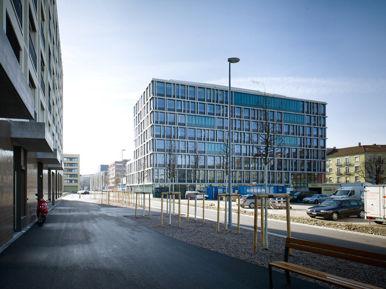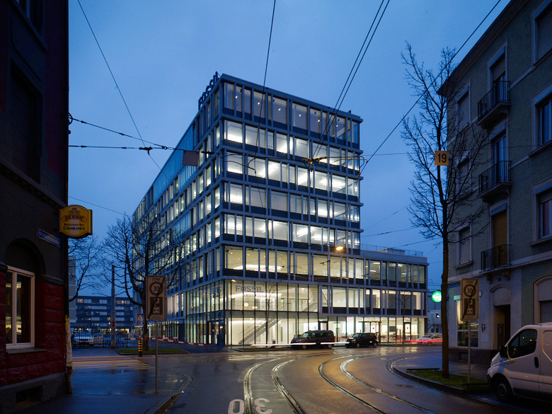 Die Fassade des Gebäudes ist mehrschichtig aufgebaut. Die innere Glasschicht mit undurchsichtigen Brüstungsfeldern bildet einen homogenen Kubus. Dieser kommuniziert seine innere Funktion nach aussen und macht die mehrschichtige Architektur des Gebäudes transparent. Die äussere Gebäudeschicht aus vertikalen und horizontalen Faserbetonelementen strukturiert das Volumen in einer aufgelösten Ordnung. Dies verstärkt die Präsenz und Kraft des Neubaus im städtischen Kontext.