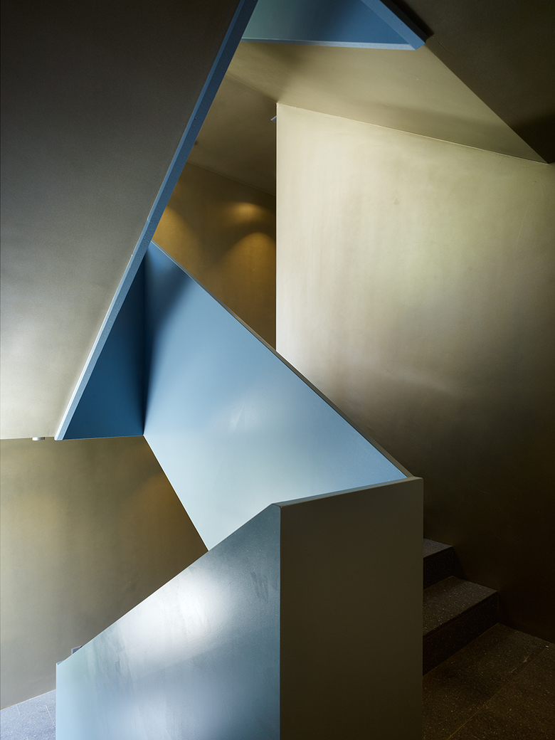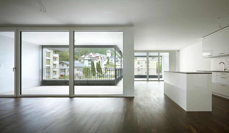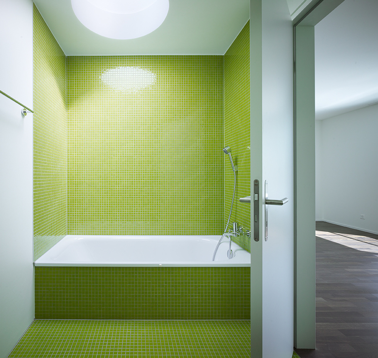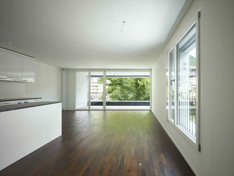 Die Obergeschosse werden konventionell über Treppenhäuser erschlossen. In zwei dreispännigen Anlagen werden grosszügige, konsequent zum Park orientierte Stadtwohnungen angeordnet. Charakteristisch für die Wohnungen sind die offenen, lichtdurchfluteten Raumsequenzen sowie ihre konsequente Orientierung zum Aussenraum im Westen. Grosszügige und gedeckte Balkone werden in das Gebäudevolumen integriert und bilden eine räumliche Erweiterung der Wohn- und Essbereiche.