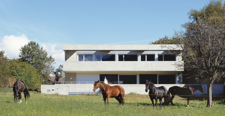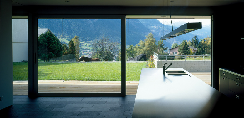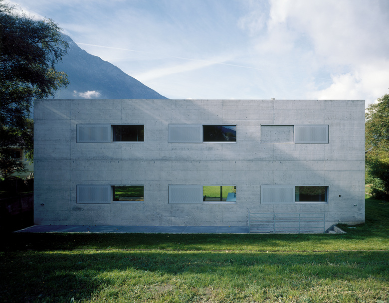 Auf einem sanft ansteigenden Plateau über der Stadt Brig gelegen, orientiert sich das Haus nach Südwesten längs ins offene Tal hinaus. Die durchgehende Balkonschicht im Obergeschoss betont zusätzlich die Hinwendung zur Sonne. Ein Betonrahmen über dem Balkon spendet Schatten und fasst den Kubus zusammen. Im Inneren folgt der Grundriss der strengen und doch offenen Ordnung des Baukörpers. Das Erdgeschoss ist ein einziger grosser Raum, der mit Schiebetüren unterteilt werden kann. Im Obergeschoss reihen sich die Zimmer entlang des fassadenseitigen Korridors auf.