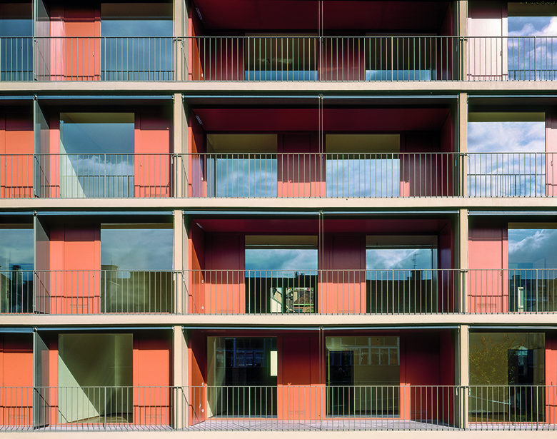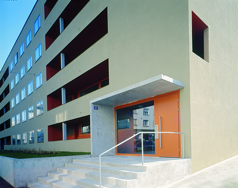 Das Haus wurde ursprünglich für Saisonniers eines Bauunternehmens erstellt und verfügte über 50 kleinteilige Wohnungen. SSA Architekten übernahmen die Schottenstruktur des Gebäudes und die Erschliessung der Wohnungen über strassenseitige Laubengänge, veränderten aber innerhalb des Systems die äussere Erscheinung wie auch die Grundrisse grundlegend. Während die Strassenfassade wie zuvor mit einer deutlichen Bänderung das Erschliessungsprinzip abbildet, wurde die Hoffassade stärker geöffnet und durch ein System von einheitlichen Elementen gegliedert. Über Rücksprünge in der Fassade werden die 2.20 Meter tiefen, gedeckten Balkone ausgebildet.