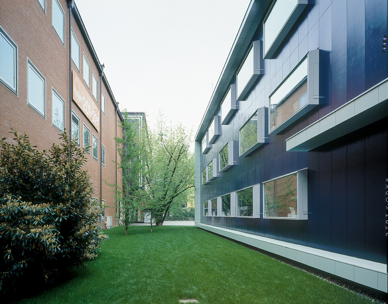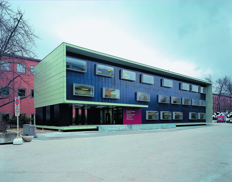 Das Service Center steht an repräsentativer Lage auf dem Messeplatz unmittelbar vor der Rundhofhalle, die 1953/54 von Hans Hofmann erbaut wurde. Das Service Center umfasst auf drei Geschossen und einer Fläche von circa 1’050 m2 verschiedene Dienstleistungsabteilungen sowie ein Pressezentrum. Der Zugang zum Gebäude erfolgt durch eine Vorhalle, die in den Gebäudequader eingeschnitten ist. Zwei im Schnitt versetzte, zweigeschossige Hallen bieten dem Besucher bereits vom Eingang her den Überblick über das gesamte Dienstleistungsangebot. Neuerungen im Holzbau ermöglichten die Verwendung grossformatiger Fassadenelemente und entsprechend gross dimensionierter Fenster. Die dunklen Fassadenplatten unterdrücken das Fugenbild und lassen die Fassaden flächig erscheinen. Der schlichte Baukörper wird durch den umlaufenden Rahmen begrenzt, der gleichzeitig auch die fensterlosen Stirnfassaden bildet.