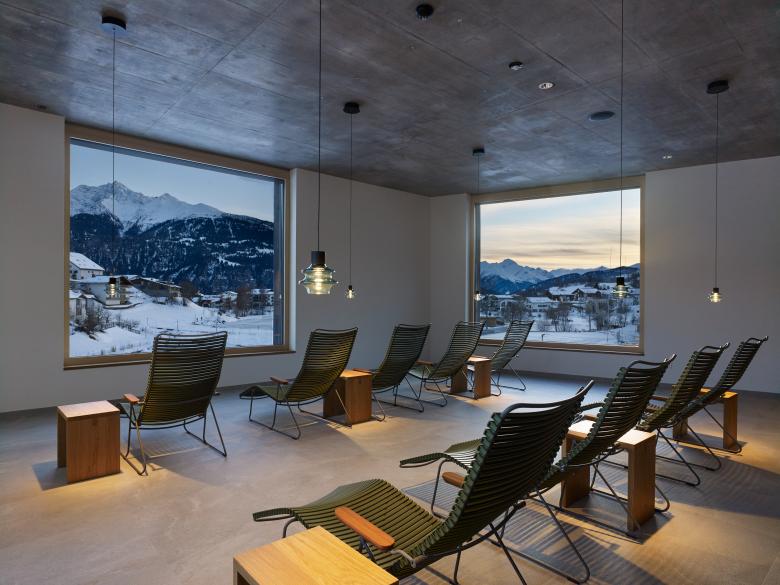 Herzstück der Gesamtanlage ist der Empfangsbereich hoch über der Strasse auf dem Niveau des neu gestalteten Aussenbereichs auf dem Hallenbaddach. Dieser Bereich wird strassenseitig über eine attraktive Kaskadentreppe erschlossen und ist Ausdruck der neuen Welt mit einer ihr eigenen Atmosphäre. Von dieser zentralen Ebene aus werden alle anderen Bereiche (Schlafbereich, Hallenbad, Wellness, Restaurant und Aussenbereich) über kurze Wege erreicht.