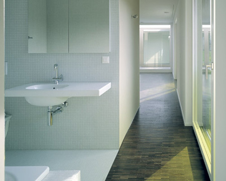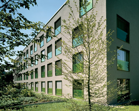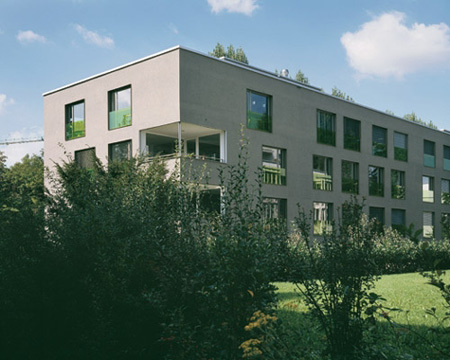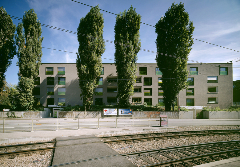 Das Projekt ist das Ergebnis eines Studienauftrags und setzt mit dem reduzierten, kubischen Bauvolumen in der heterogenen Agglomerationsumgebung einen deutlichen städtischen Akzent. Sandquarz-Anteile in der glatten Aussenputz-Fassade beginnen je nach Tageslichtintensität zu schimmern und verleihen dem Monolithen hinter der markanten Pappelreihe einen edlen Glanz, der an ein festliches Glitzerkleid erinnert. Dass es jedoch kein auftrumpfendes, sondern ein dezentes Kleid ist, zeigt die radikale Beschränkung der Öffnungen auf ein einziges Fensterformat im zwar strengen, aber nicht sklavisch befolgten Raster. Im Gegensatz dazu stehen die weitläufigen, offenen Wohnungen, die dem Prinzip des Mäanders folgend, eine reichhaltige Abfolge von Raumeindrücken offerieren.