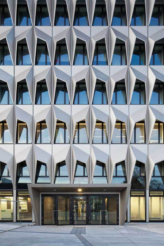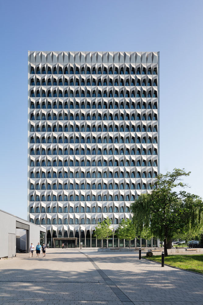 The plans here were for the C10 highrise building, built in the mid-1960s, to be architecturally remodelled and technologically upgraded so that it might continue in its emblematic status as sole highrise in the area to announce throughout the city the location of the Darmstadt University of Applied Arts campus. Each facade was lent a special quality according to the compass direction it faces and its setting within the campus and the city. The southern front, for example, was completely covered with three-dimensional light-metal folding elements functioning as sunshades for the existing windows and allowing for the optimum balance between daylight and sun protection. The geometric layout of the fixed, low-maintenance sunshades was developed with the help of the Transsolar company out of specifications calculated by simulating the course of the sun. The northern, longitudinal side of the building facing the city centre was given an elegant glazed facade of large panes equipped with vertical pilaster strips to shade the slanting rays of the eastern and western sun. The vertical light-metal relief on the east and west facades emphasises the upward thrust the narrow sides of the building, reinforcing the optical effect of its proportions.