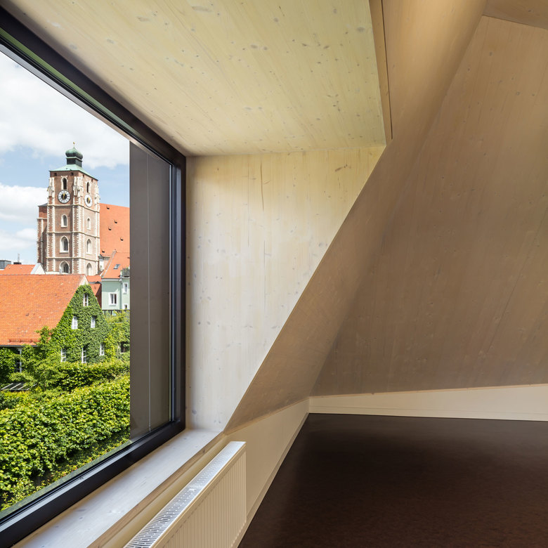 In an effort to incorporate the new volume sensitively into its heterogeneous environment, a polygonal structure was chosen whose form responds to the features of the immediate surroundings. The street façade of the new wing is angled in slightly in order not to obscure the “Old Anatomy” and to reinforce the readability of this listed monument as an independent structure. The polygonal roof planes mediate between the rooftop of the old building and those in the neighbouring old town. The public passage into the garden of medicinal plants also has a polygonal shape, widening towards the garden.
