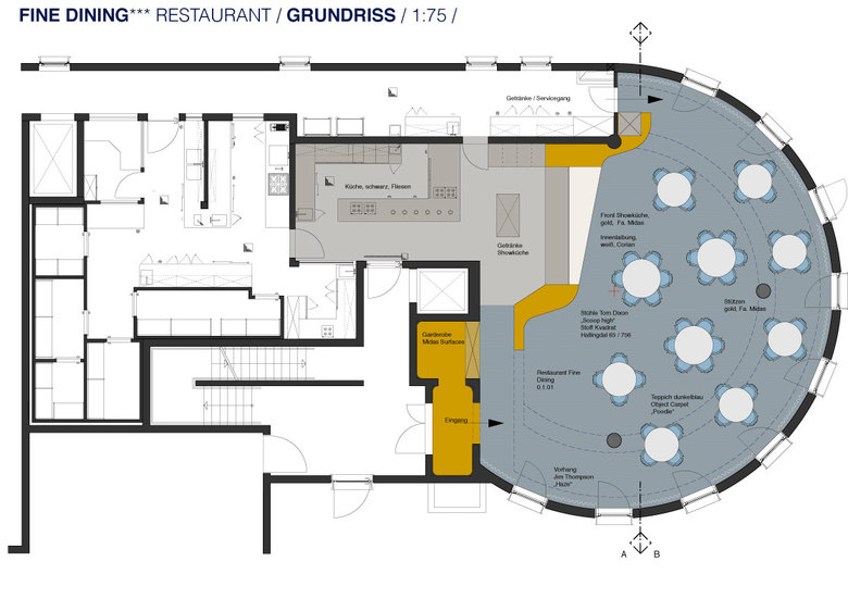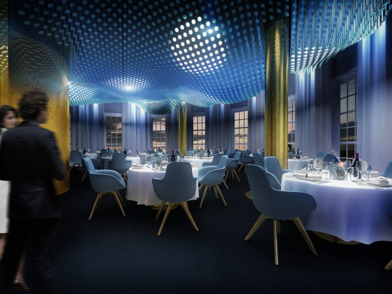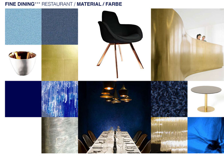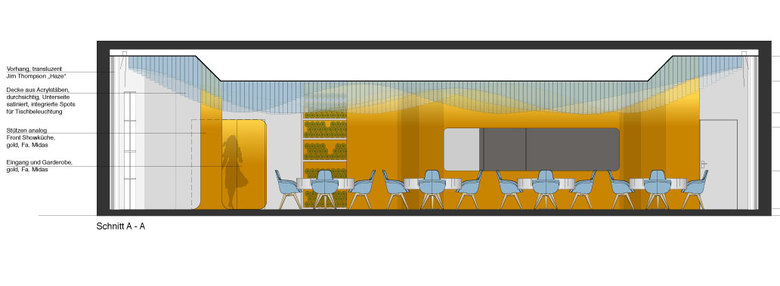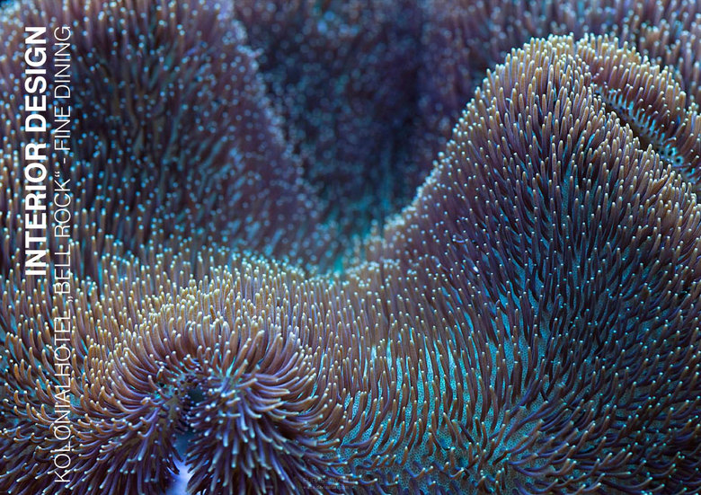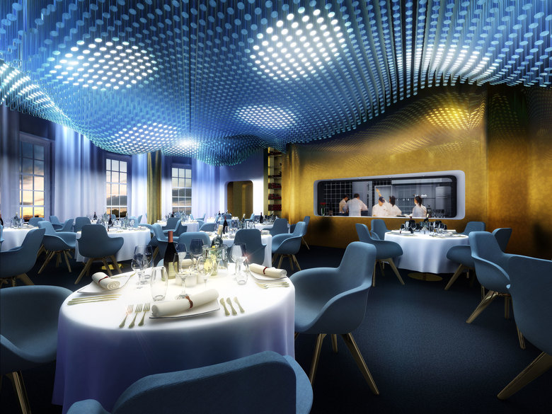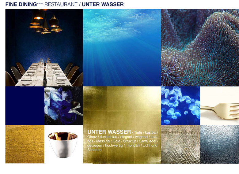 Fine Dining Seafood-Restaurant, designed as an underwater-restaurant with a curved and waved Ceiling, made of acryl glass bars, simulating the lightreflexions of the ocean.