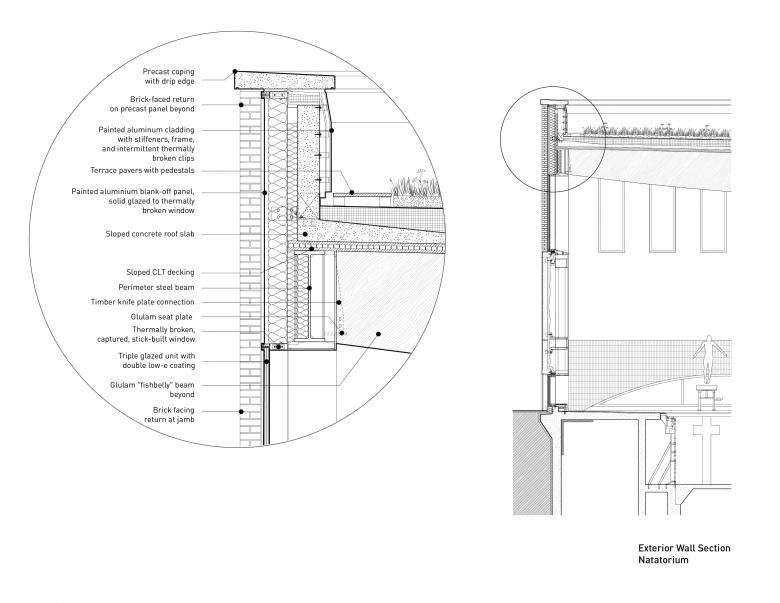 To achieve a low carbon footprint, the team carefully modeled and optimized the Center’s energy use. The design includes a high-performance building envelope, an energy recovery system, and all-electric heating and cooling. A whole-building life-cycle assessment guided material choices, helping to reduce the environmental impacts of extraction, manufacturing, and transport. The design also prioritizes healthy and durable materials, such as mass timber which performs well in humid pool areas. These efforts are complemented by expanded tree cover, green roofs, water use reduction strategies, and a responsible stormwater system, contributing to a healthier, more connected community and environment.
