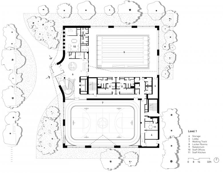 The Center’s three lower levels are dedicated to recreation and exercise. They house a gymnasium, walking track, and double-height competition-grade swimming pool—all of which are visible from the lobby—as well as dance and fitness rooms. Openings between floors maximize visual and physical connections between programs and establish a vibrant and airy atmosphere. The Center’s upper level is designed to host a range of community amenities from afterschool programs to a media lab, named for East Flatbush business leader Dr. Roy A. Hastick, Sr. Daylit learning spaces for kids, teens, and adults lead outdoors onto a wrap-around rooftop terrace and gardens where people can connect with nature in a peaceful environment that nurtures their physical and mental health.
