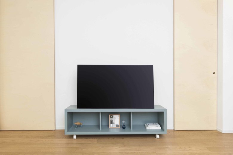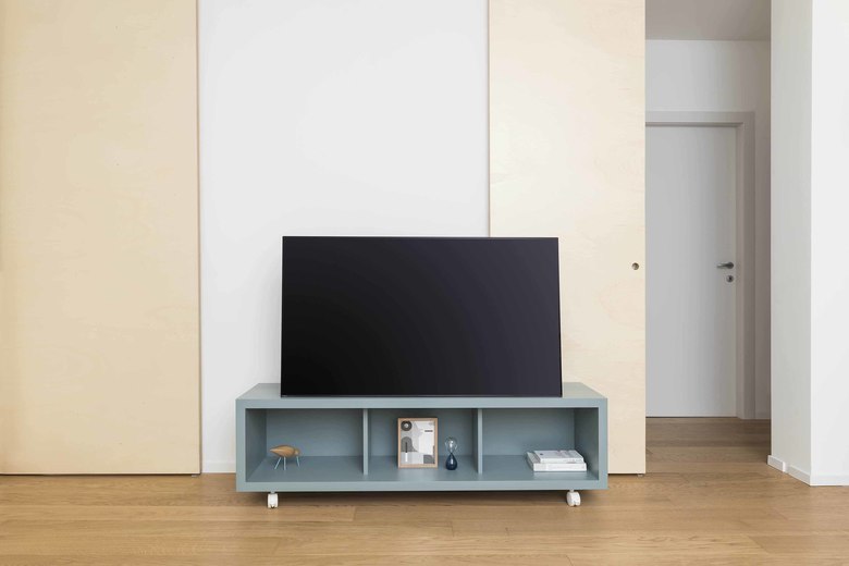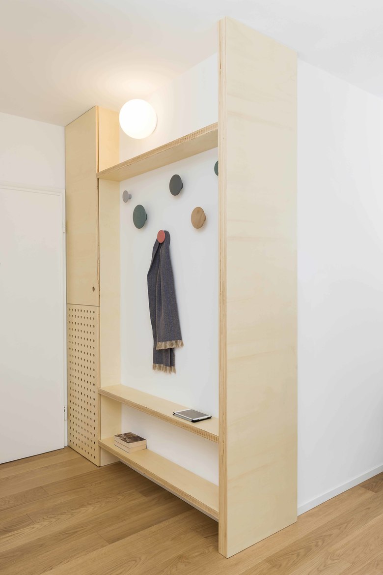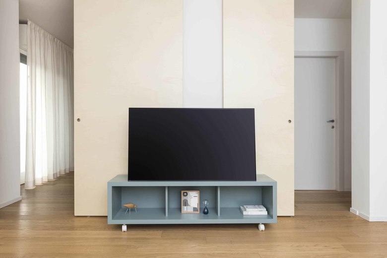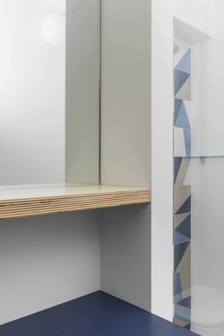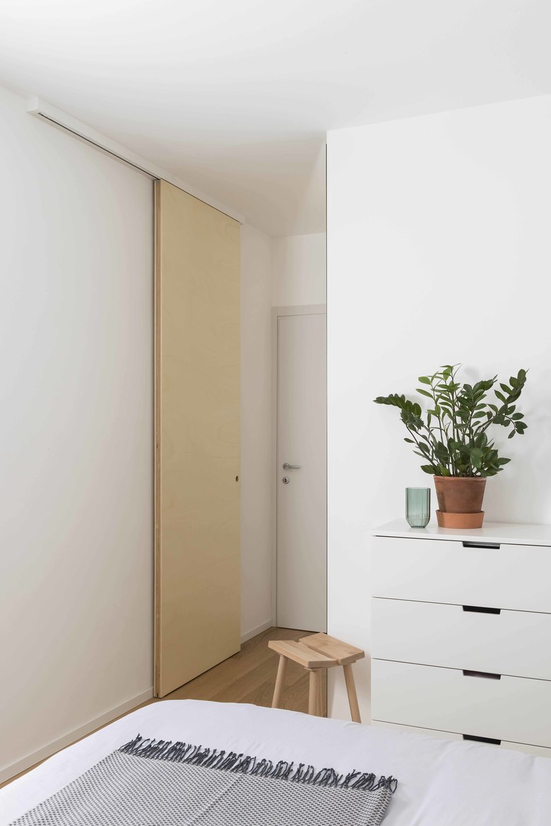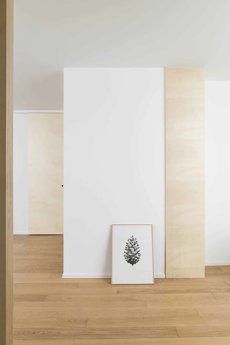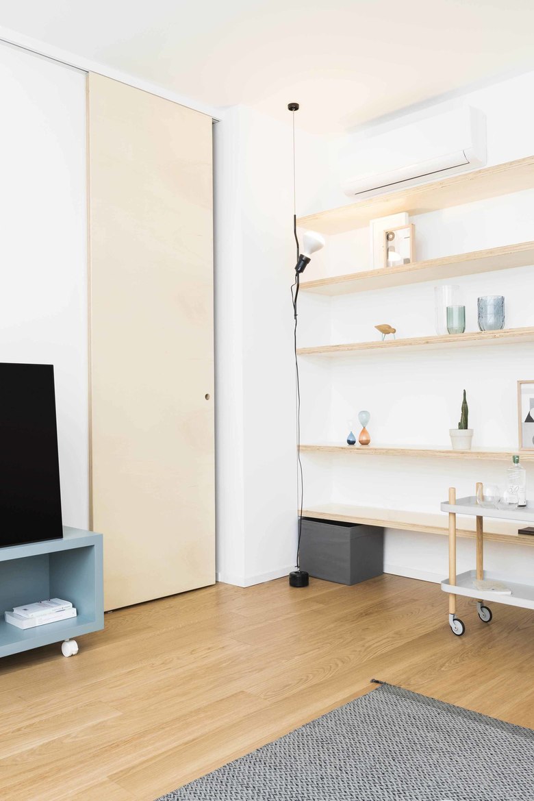 In un gioco di prospettive e visioni di scorcio l’introduzione di elementi monomaterici in multistrato di pioppo, come porte e altri dispositivi d’arredo, produce continui rimandi visivi tra i diversi ambienti della casa. Le porte scorrevoli del soggiorno si muovono quasi a costituire delle quinte teatrali.