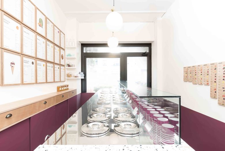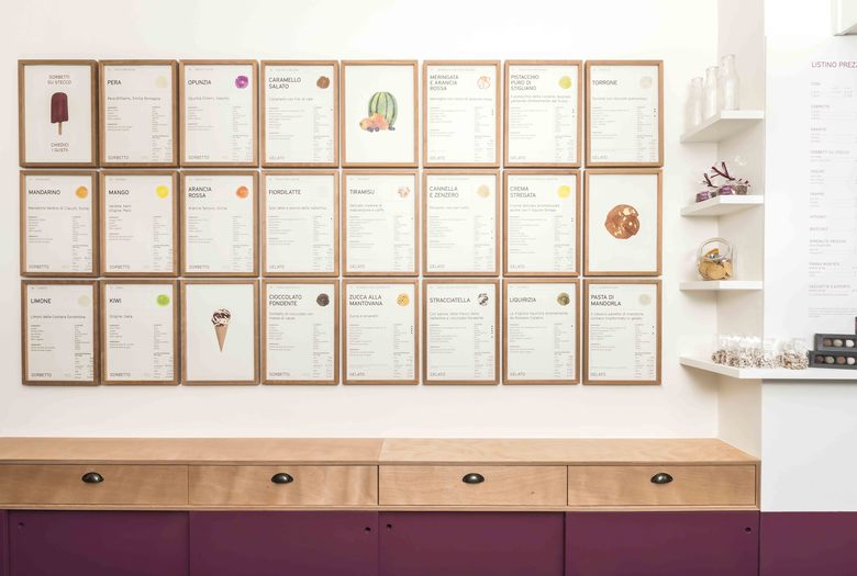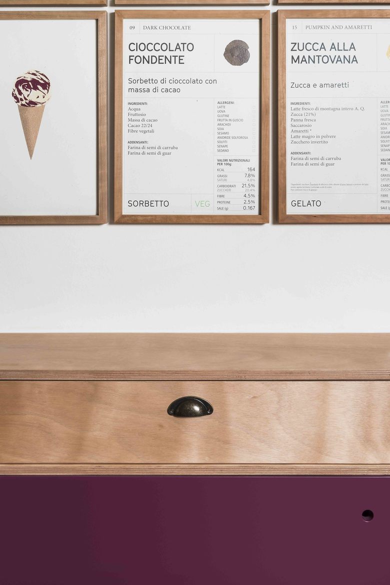 I gusti sono raccontati tramite una parete di cornici di legno contenenti le relative schede tecniche, una sorta di “tavola periodica” del gelato.