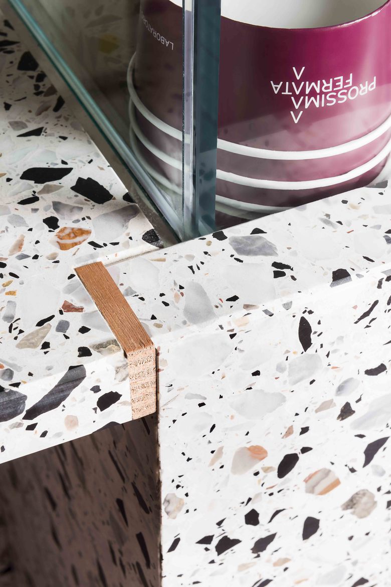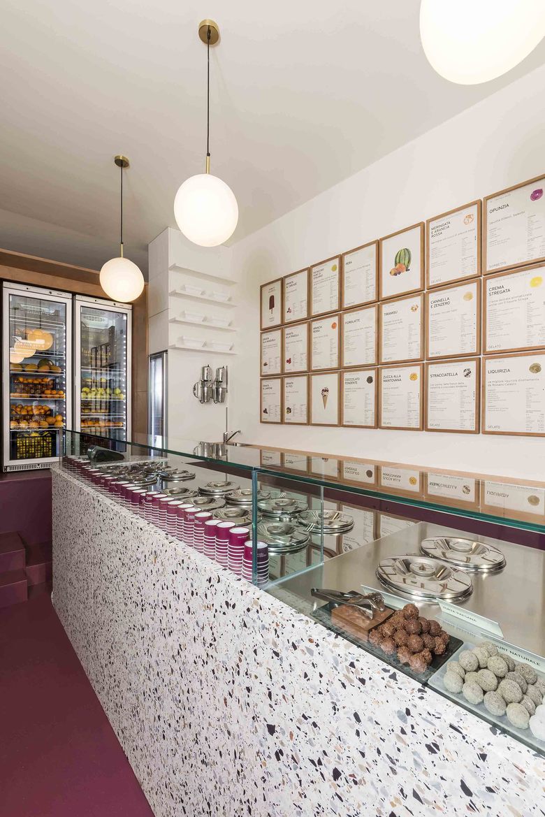 Il bancone dei gelati dalla forma squadrata e monolitica è rivestito da lastre di graniglia, un materiale semplice che rievoca i valori genuini della tradizione.