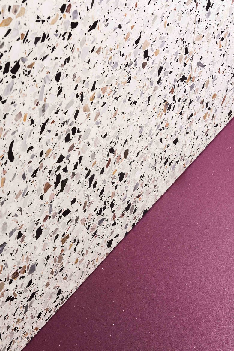 Il pavimento e una parte delle pareti è stata rivestita di linoleum color borgogna che segna una sorta di piscina colorata che raccorda la quota del laboratorio con lo spazio del negozio. Questo cambio di materiale mette in risalto il bancone e minimizza le stratificazioni tecnico/funzionali pre-esistenti.