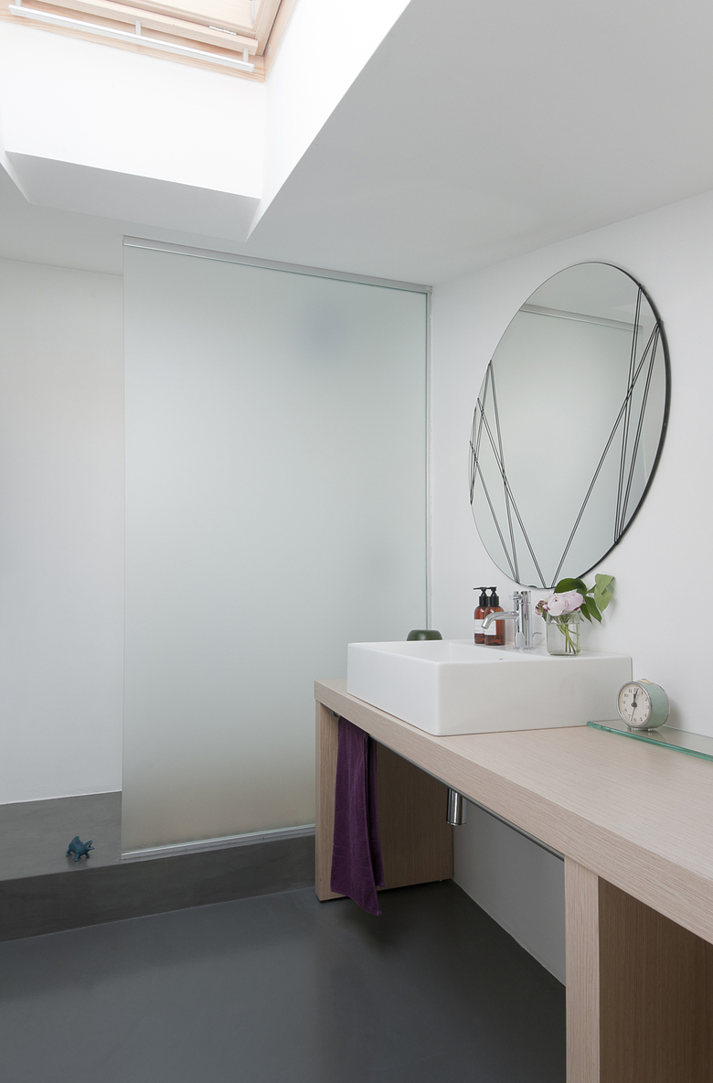 L’appartamento è caratterizzato dalla presenza di un unico elemento di arredo fisso, un diaframma che divide i differenti ambienti e funge da contenitore.