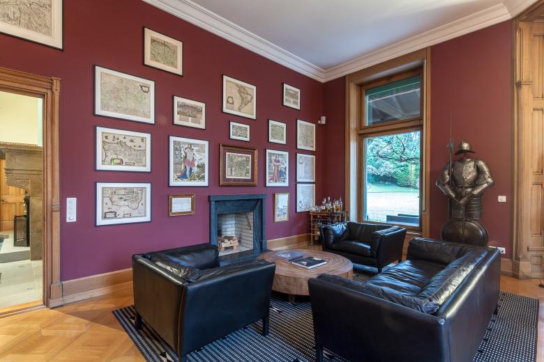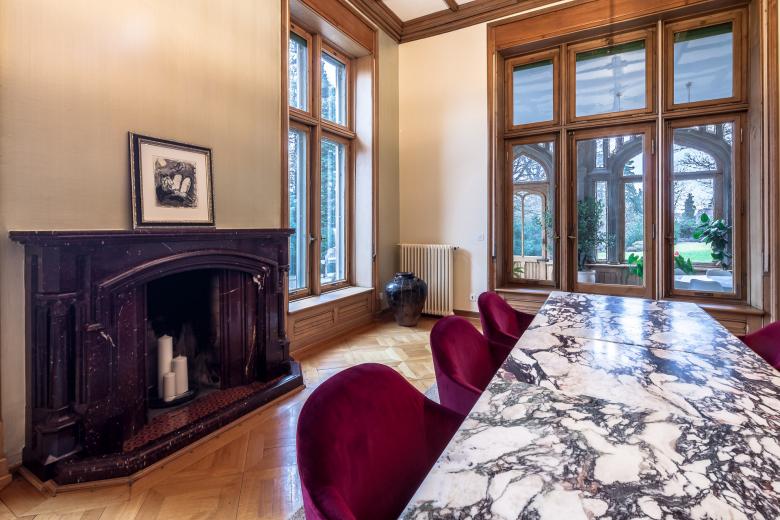 The Mid-19th century NEO-GOTHIC VILLA is a jewel hidden in the hills of the elite Gold Coast of Zurich. We refurbished interior and simultaneously preserved historical building. The selected materials and a jewel-toned colour palette set the environment warm. The pool billiard and foosball table form a contrast to the living area with fireplace and yet a relaxed environment prevails. The soft blue and green tones combination of the salon is accentuated by the lush garden in the background. The subtly gold-painted wall enhances the flamboyant dining room arrangement of eight velvet clad chairs surrounding a bespoke customised marble table. More at https://www.studioforma.ch/architecture-projects/interior-design/neo-gothic-villa