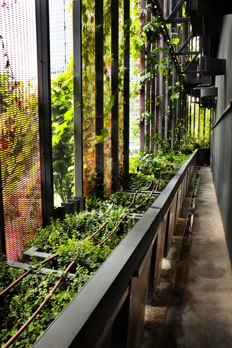 As responsible landscape architects, we stressed the necessity of good soil depth and easy maintenance access to all the planters serving the iconic image of this “living breathing” façade. The architects were therefore asked to provide 1M deep planters all along the edge of the façade, at each level or at least every other level of the building - with one planter for 3 panels of steel mesh. However, even while we strongly advocated for lift access to every planter level for the ease of workers, ultimately access is via cat-ladders.
