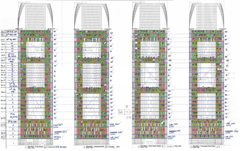 The site is tiny, and the building footprint occupies it entirely, minus the mandatory planting buffers. With the tower in stratums – each for a different section of accommodation – the surface area of the site is multiplied four times, as the four sky gardens at levels 6, 12, 21, 27 become as “new ground” planes overlooked by either apartments or hotel rooms, one sheltered by the next terrace above, until the last plane is open to sky at level 27.