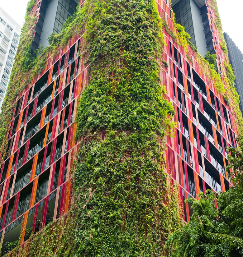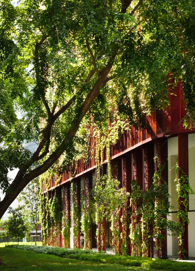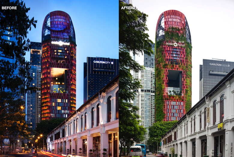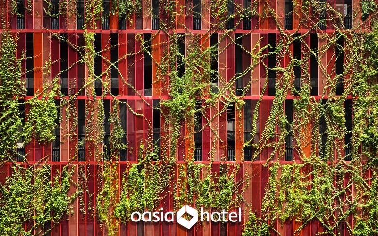 The Oasia Downtown Hotel, in Singapore’s business district, near Chinatown, distinguishes itself as an unforgettable visual contrast, against a typically urban backdrop of concrete, steel and glass. The single slender silhouette is encased in a framework of perforated steel mesh – in colours of pink, red, maroon and orange wrapped in a “living cloak” of plants.