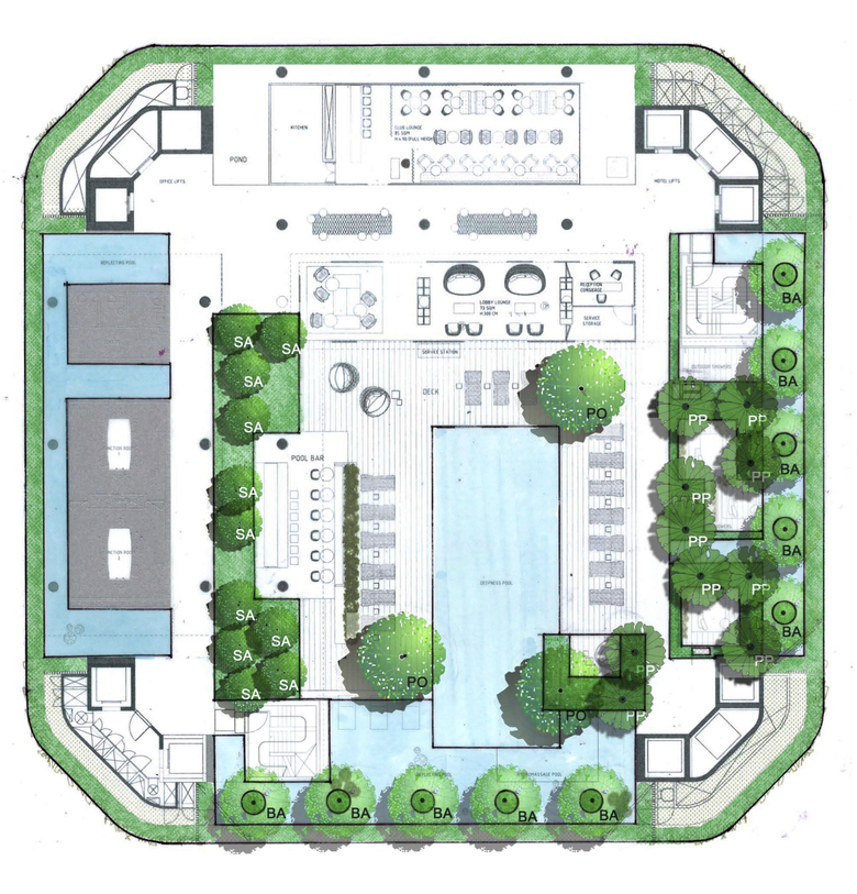 The eventual sky terraces were a result of collaborations between the architect, the landscape architect and the interior architect. Levels 6, 21 and 27 all have swimming pools and decks and intimate garden spaces with tree groupings. At level 12, the hotel reception, has a “ wild naturalistic “ garden environment, with seating pavilions on decking and glass-box meeting rooms flanking a sunken lawn space.