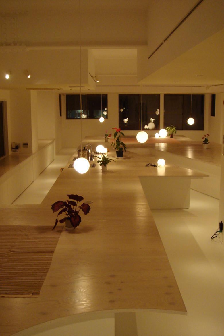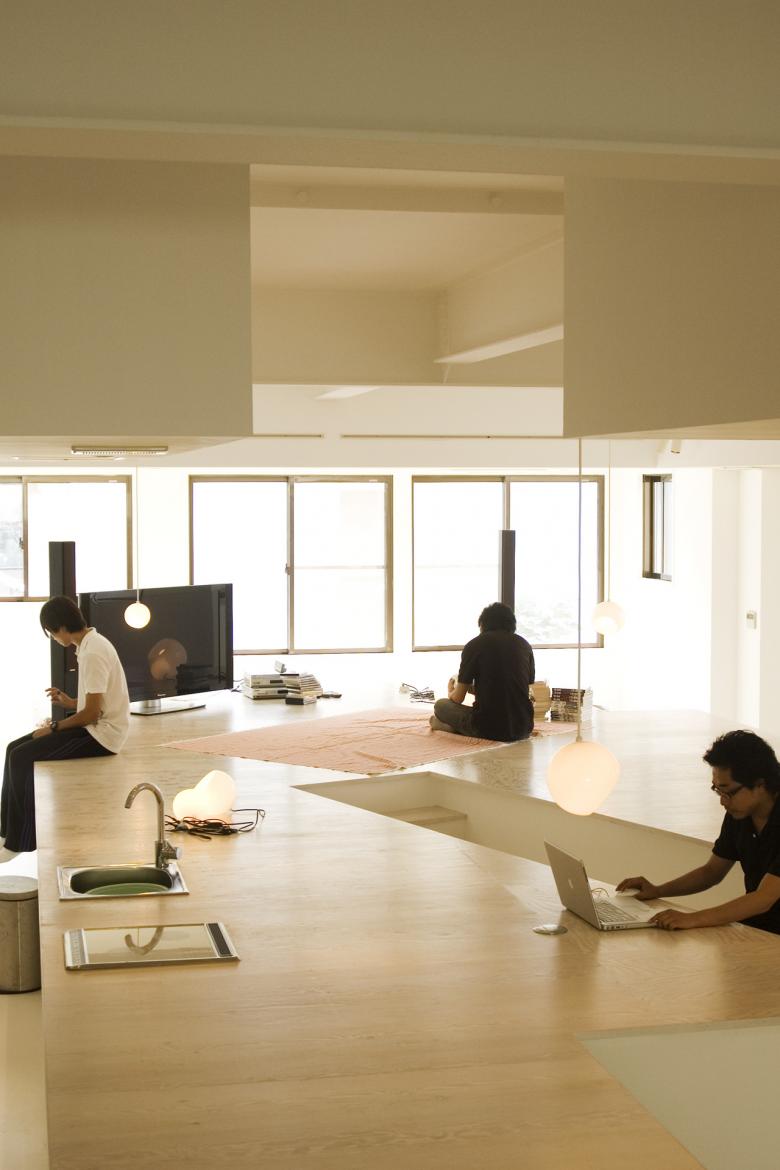 This layout featuring a one-room living room, dining room, and kitchen was designed to fit the changing needs of a family. For example, the husband had many hobbies, and required storage area for his many possessions and space to throw parties.When visiting the house, the architect realized that storage space wasn't the issue, but that the owner needed a set location to place all the objects for his various hobbies in a way that would look more orderly.