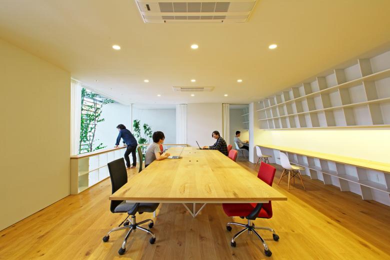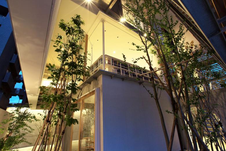 The three story building is steel-framed, employing round steel bar bracing. The first floor is occupied by a restaurant, which spills out into a park-like outdoor dining area. The second floor comprises office space, enclosed by trees rising up from the garden below. Within this area is a large central table seating eight - conducive not only to office work but also less formal gatherings. The third floor houses a multipurpose rental space incorporating a kitchen and bathroom, which opens onto an outdoor area.