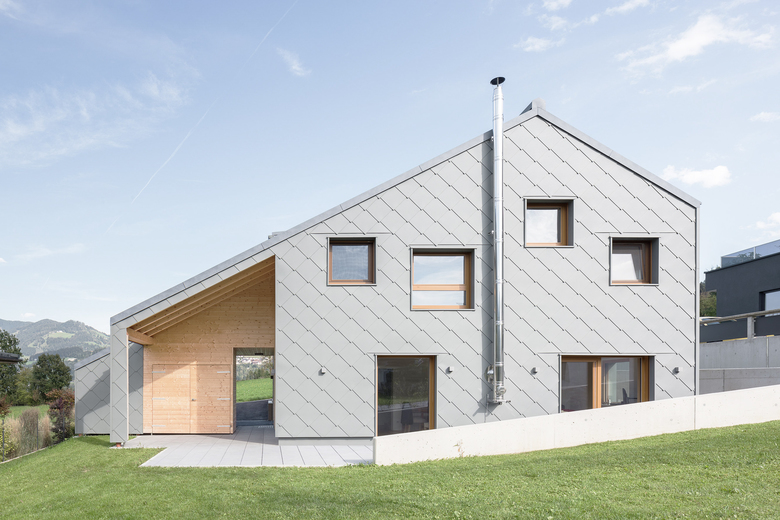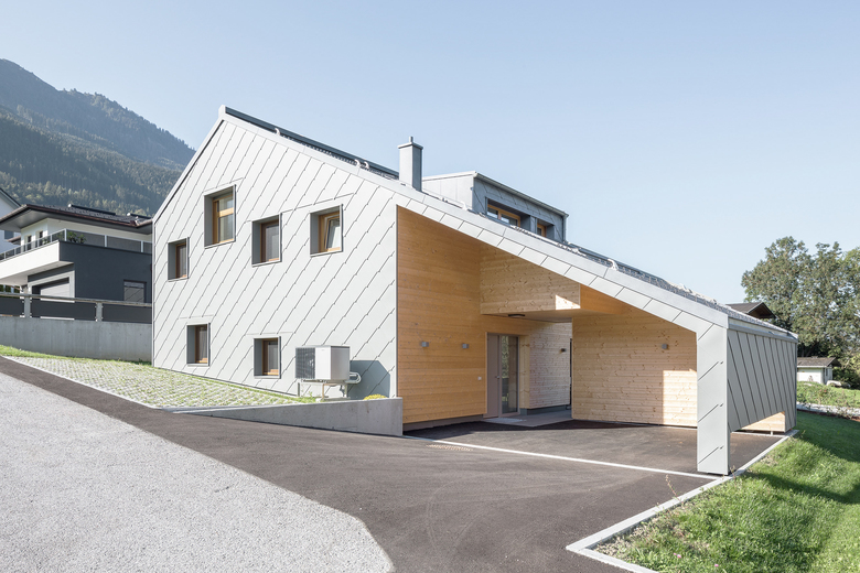 Aus städtebaulicher Sicht rückt das Gebäude so nahe als möglich an die Siedlungsstraße und lässt das bekannte Bild von Haupthaus, Nebenraum und Garage scheinbar verschmelzen. Die einheitliche Ausgestaltung von Dach- und Außenfassade unterstreicht dabei die Idee einer monolithischen und einheitlichen Großform. Diese homogene Gebäudehülle lässt das Gebäude von außen sehr reduziert und gleichzeitig „hart“ wirken, stellt aber mit den in Holz verkleideten Wandscheiben des Eingangsbereiches einen starken und gewünschten Kontrast von Schutz und Geborgenheit dar.