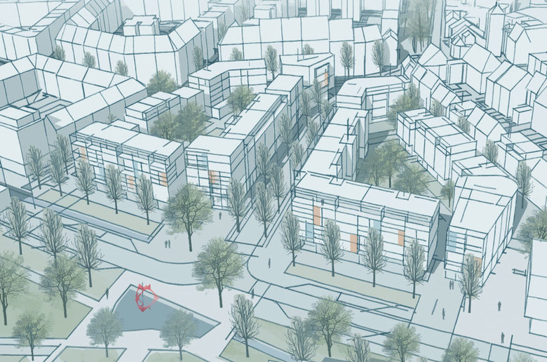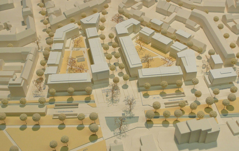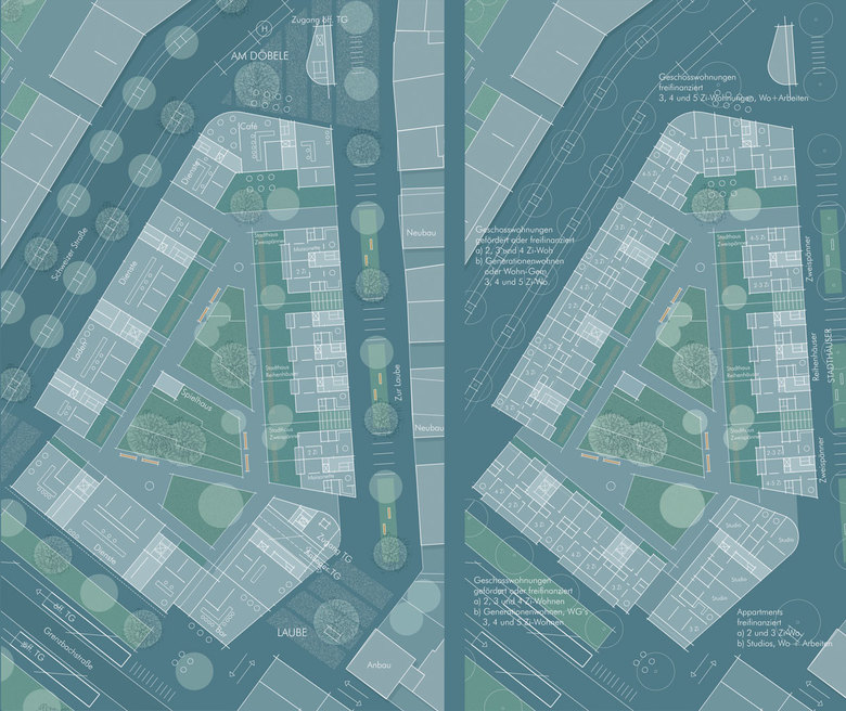 Die beiden polygonalen Baufelder geben der in leichtem Schwung zur oberen Laube führenden Hauptverkehrsstraße eine räumliche Fassung, stellen sich sich mit ihren kräftigen Strukturen lärmschützend vor die Bestandsbebauung und umschließen weitläufige begrünte Innenhöfe.