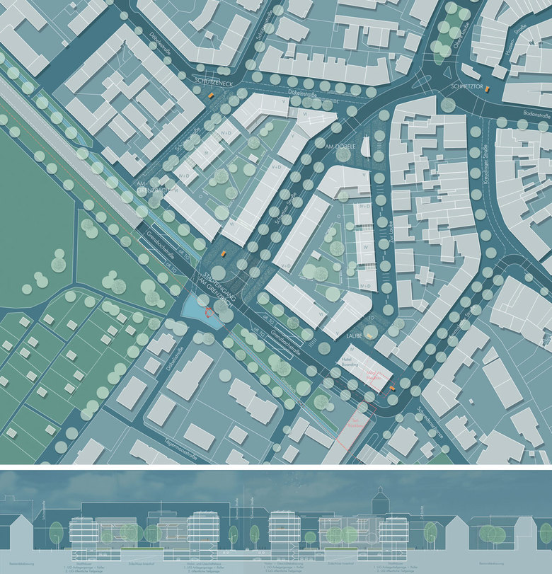 In diesem Raumgefüge, das strukturell auf die Kreuzlinger Seite eingeht, werden der neue Stadteingang sowie Quartiersplätze zu orientierungswirksamen und vernetzenden Koordinaten zwischen neuen und bestehenden Nachbarschaften.